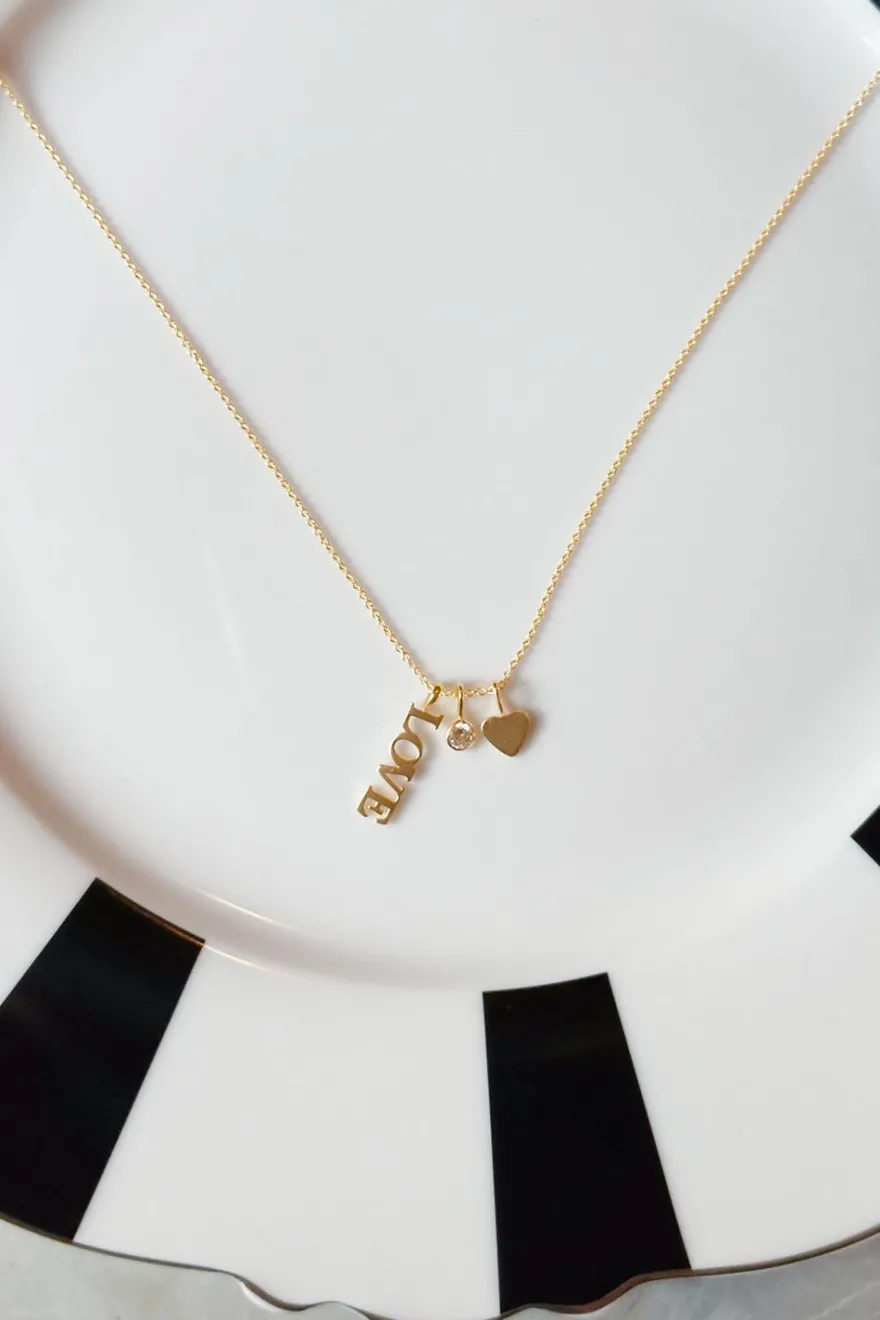 Collar de latón bañado en oro para lograr un acabado brillante y duradero con triple colgante de la palabra Love, un pequeño corazón y un delicado detalle brillante que aporta luz a la pieza. Un diseño actual y versátil, pensado para llevar a diario o como detalle especial, que combina sencillez y significado en una sola joya.