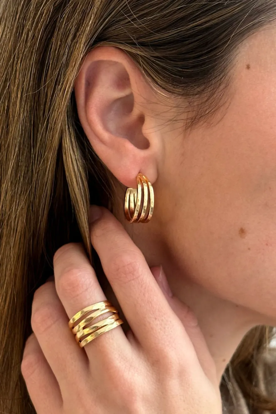 Combinación de anillo y pendientes de latón bañados en oro para lograr un acabado brillante y duradero con diseño de argollas, ideal tanto para su uso diario como para cualquier ocasión especial.