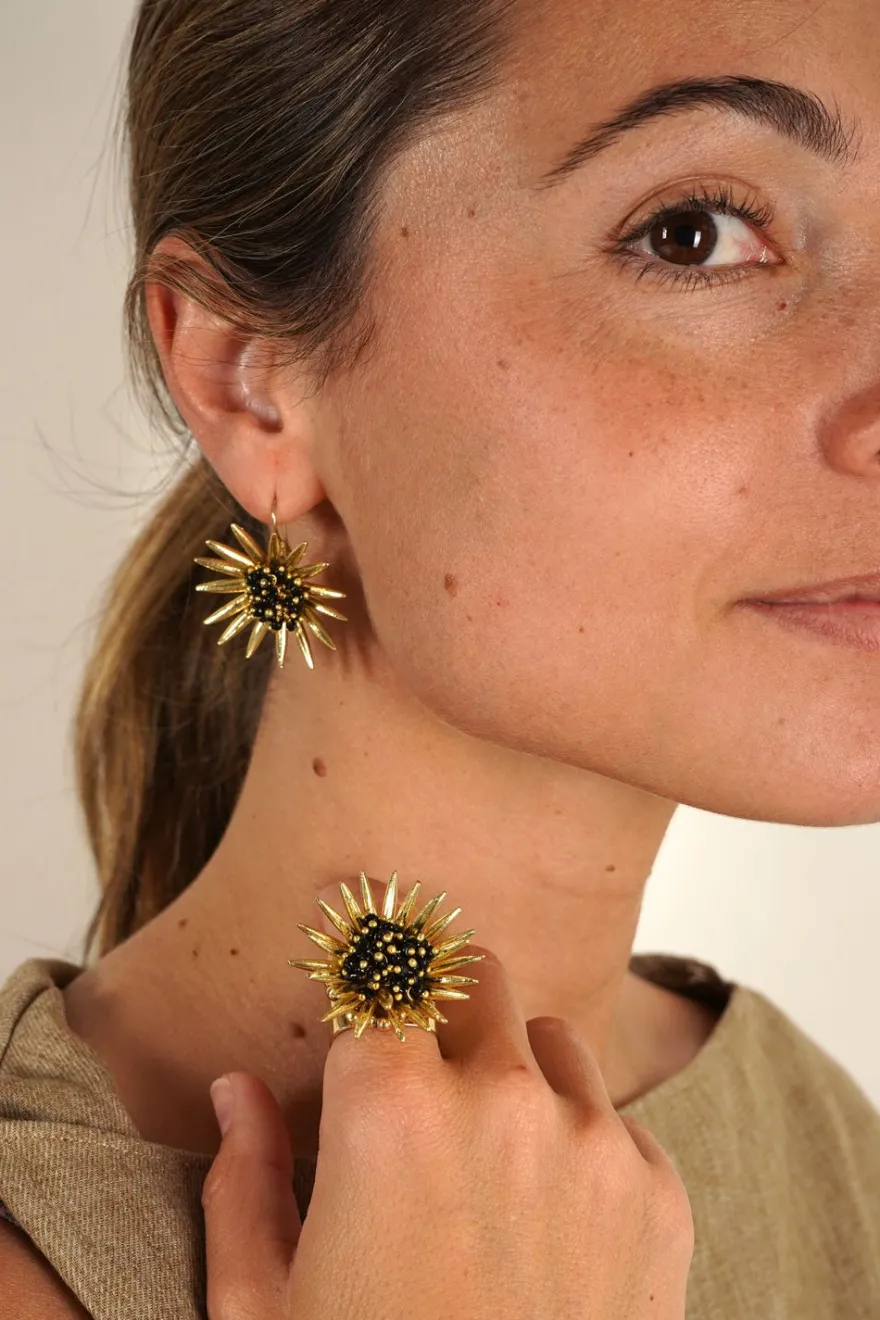 Combinación de anillo y pendientes de latón bañados en oro para lograr un acabado brillante y duradero con diseño de girasoles y cuentas negras, ideal tanto para su uso diario como para cualquier ocasión especial.