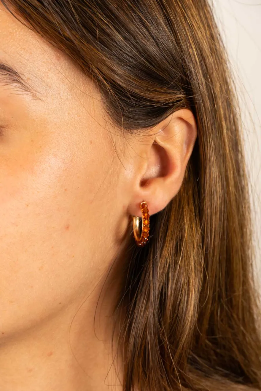 Pendientes de latón bañados en oro para lograr un acabado brillante y duradero con diseño de mini aros y piedras ámbar, que aportan un toque de brillo y calidez a cualquier look. Ideales tanto para el día a día como para cualquier ocasión especial.