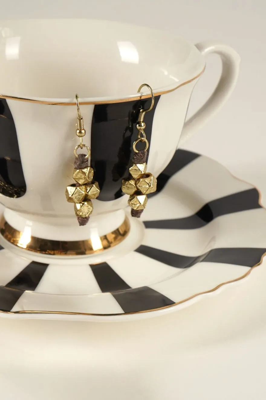 Pendientes de latón bañados en oro para lograr un acabado brillante y duradero con diseño de bolitas combinadas con hilo marrón, ideales tanto para el día a día, como para cualquier ocasión especial.