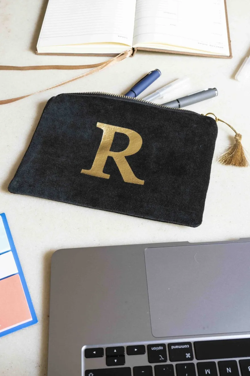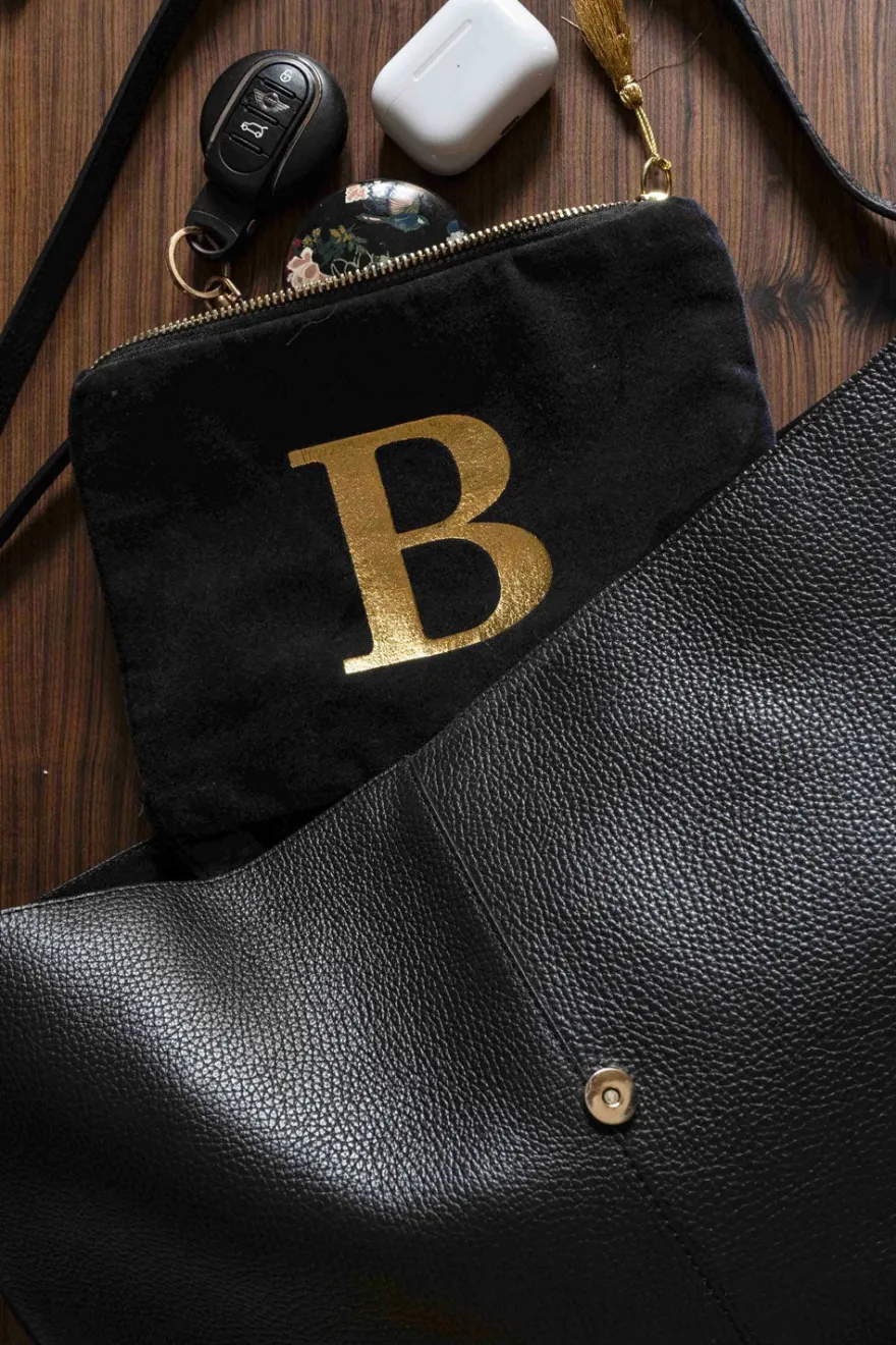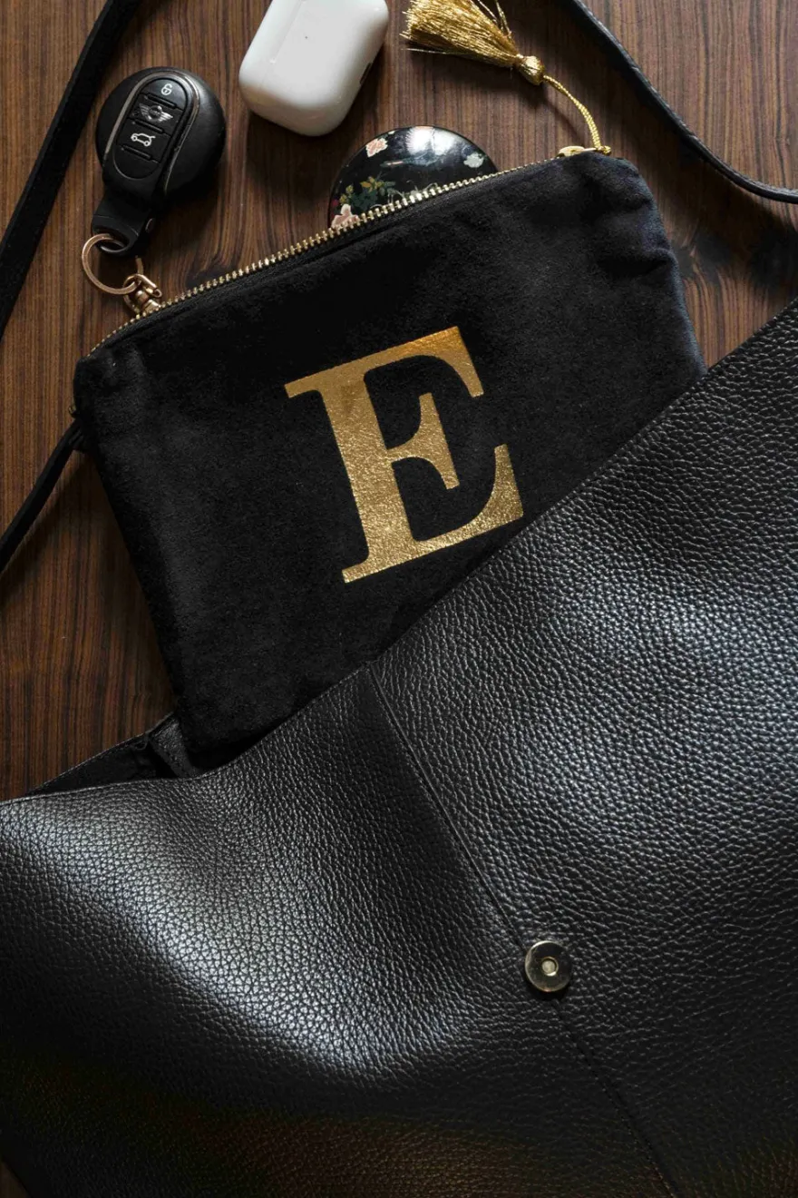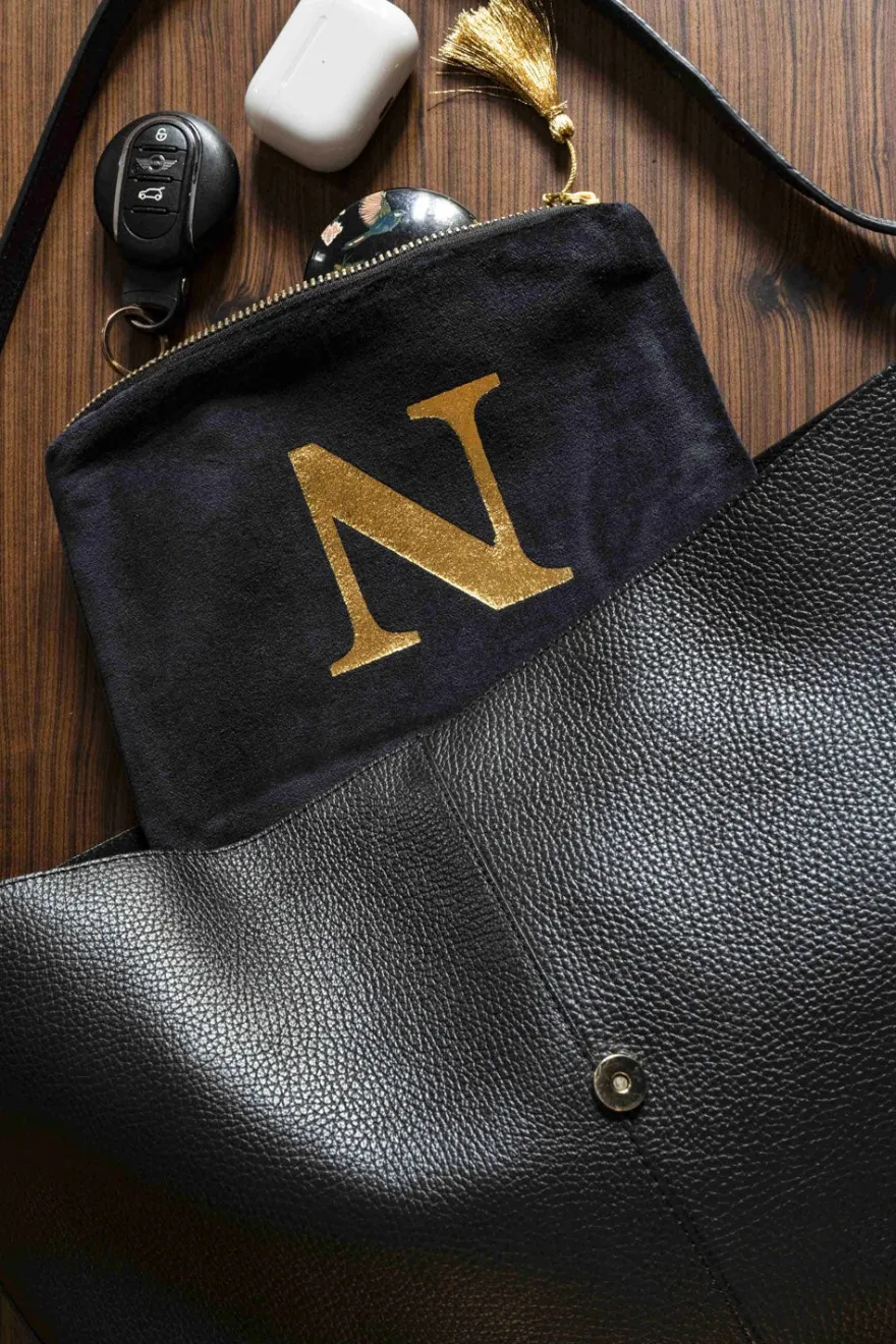 Elegante neceser de terciopelo negro con inicial a escoger y cremallera dorada. Su suave tejido de terciopelo aporta un toque de lujo, mientras que la inicial dorada, añade un detalle personal y distintivo.