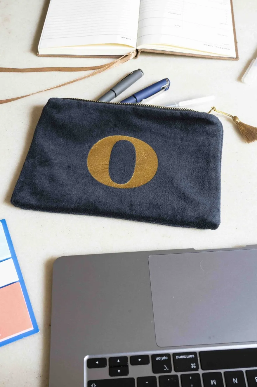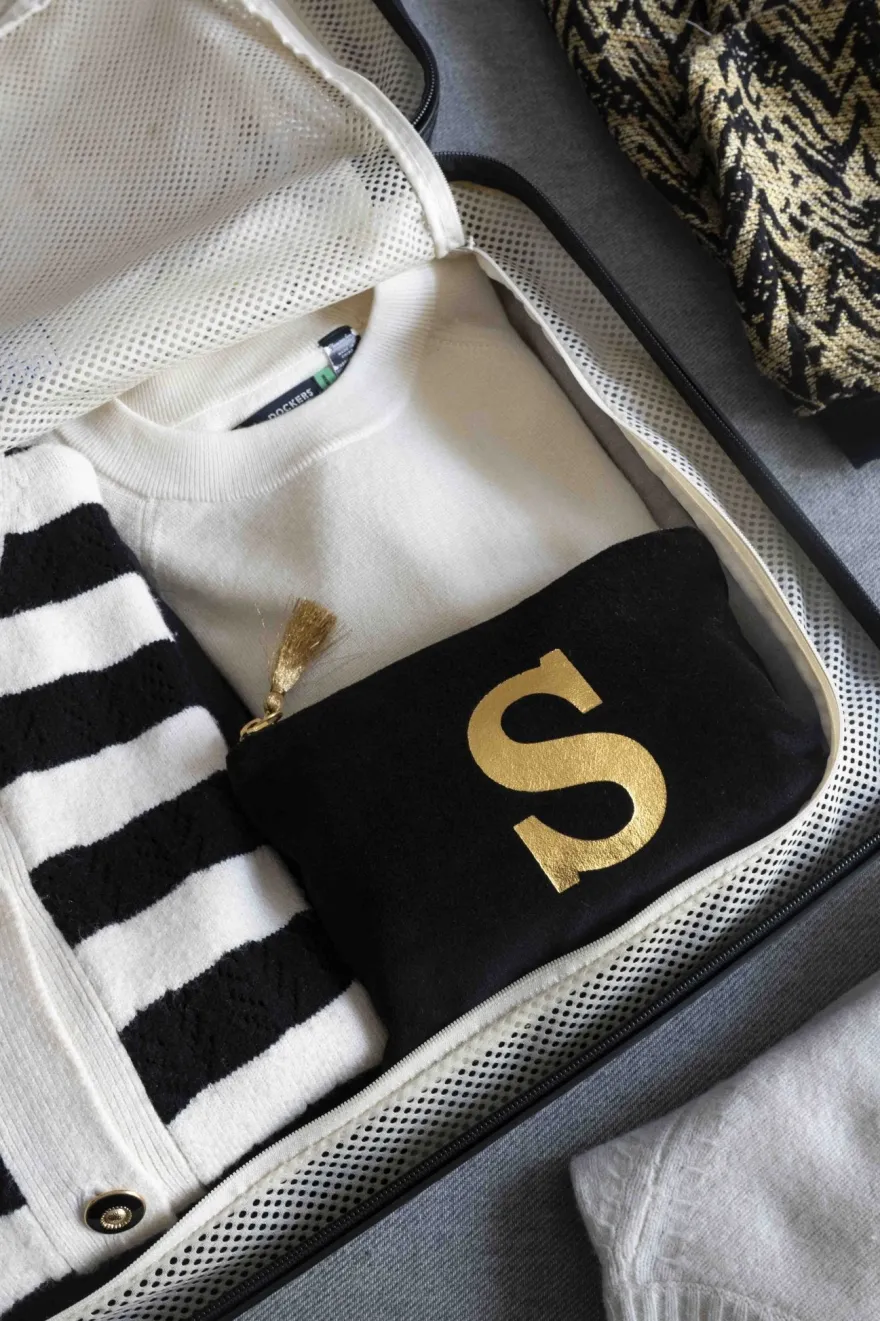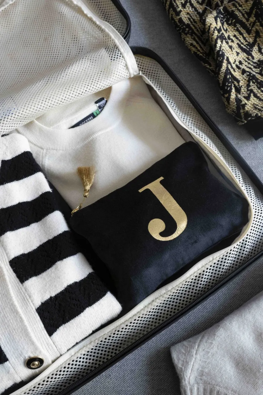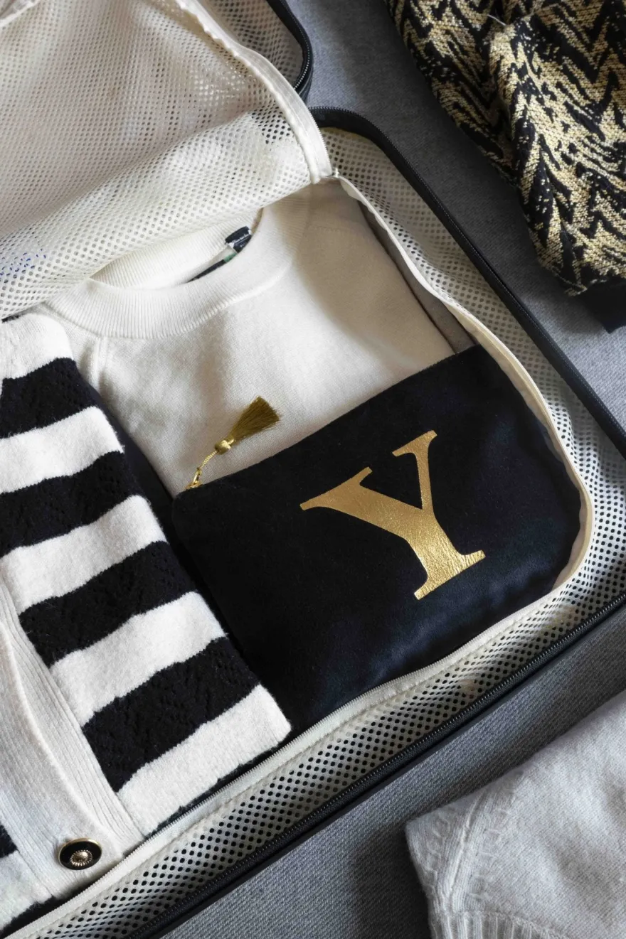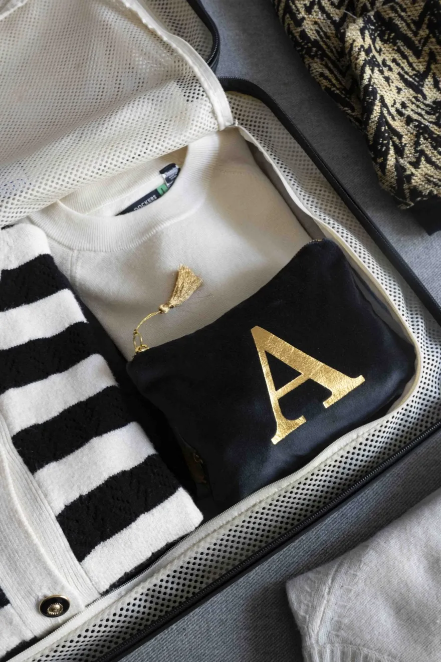Elegante neceser de terciopelo negro con inicial a escoger y cremallera dorada. Su suave tejido de terciopelo aporta un toque de lujo, mientras que la inicial dorada, añade un detalle personal y distintivo.