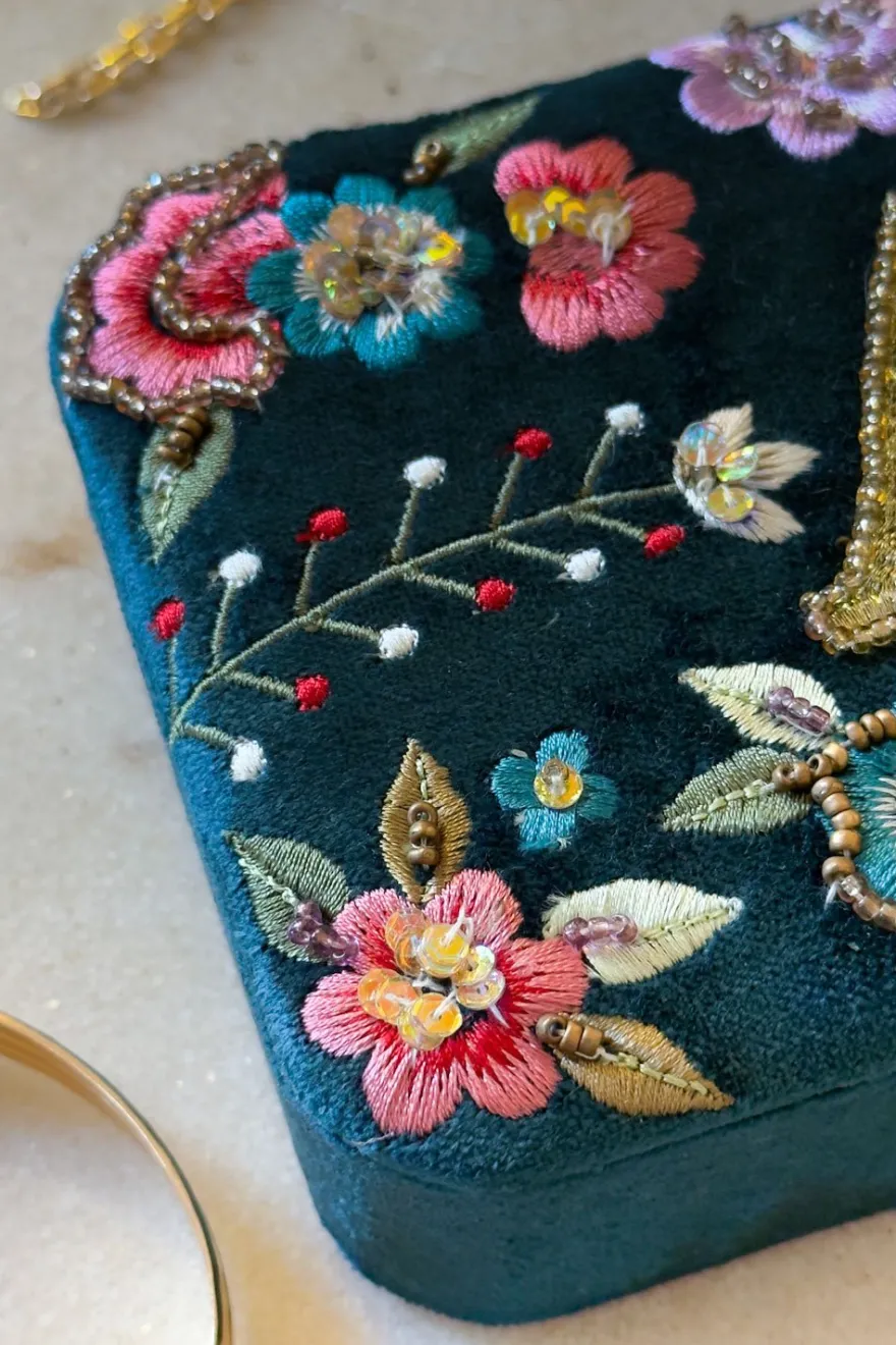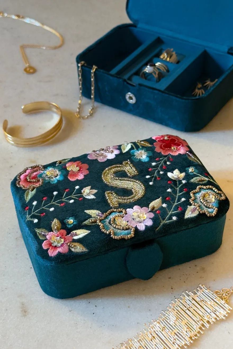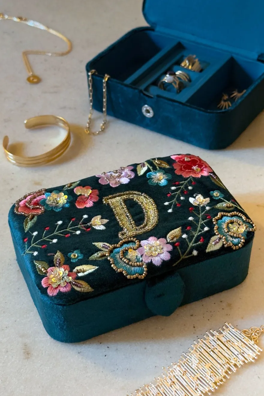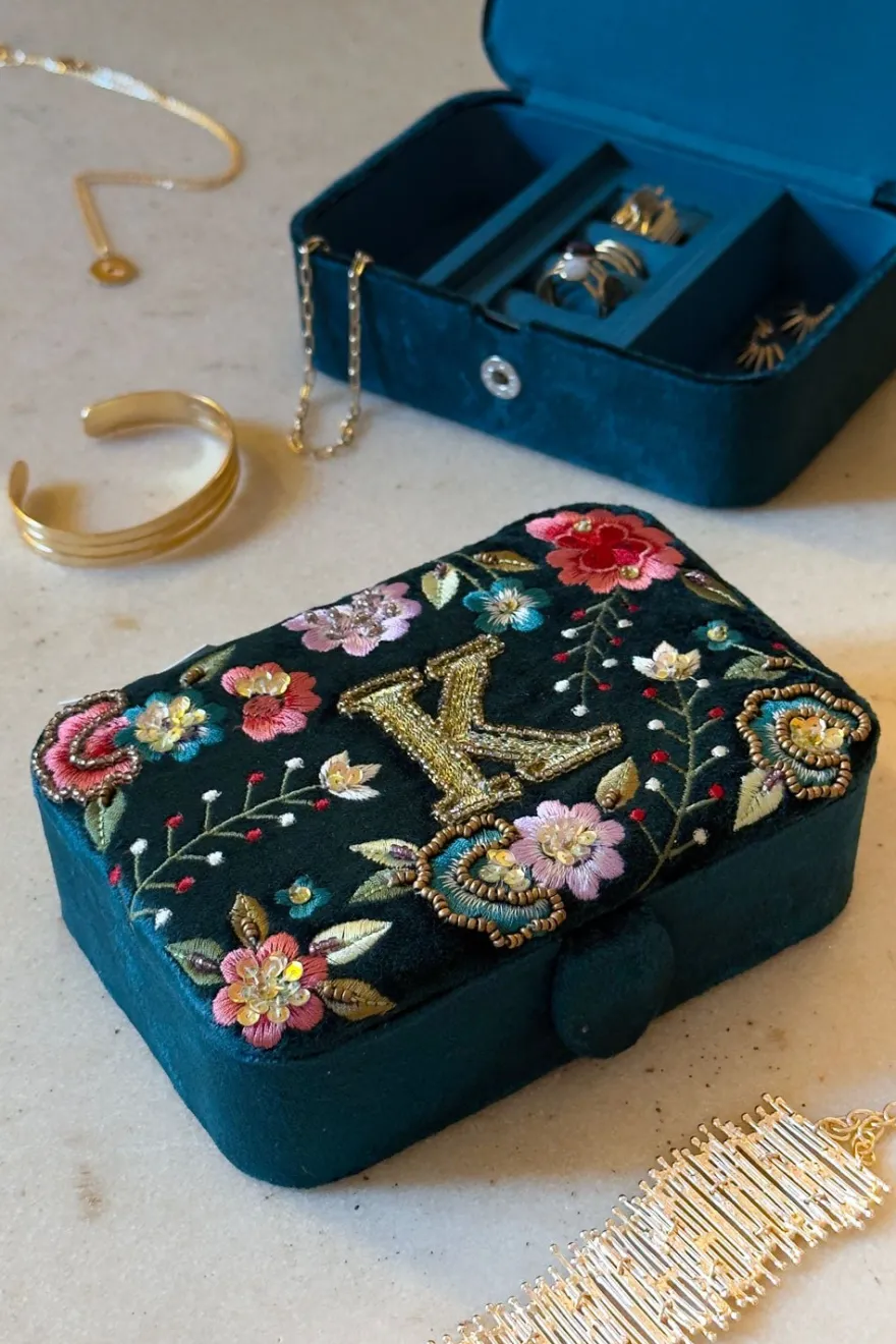 Joyero forrado en terciopelo, decorado con flores bordadas con delicados detalles de cuentas y una inicial central dorada, que le aportan un acabado elegante y artesanal.