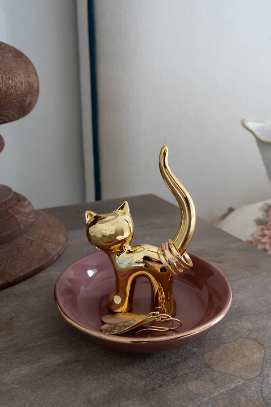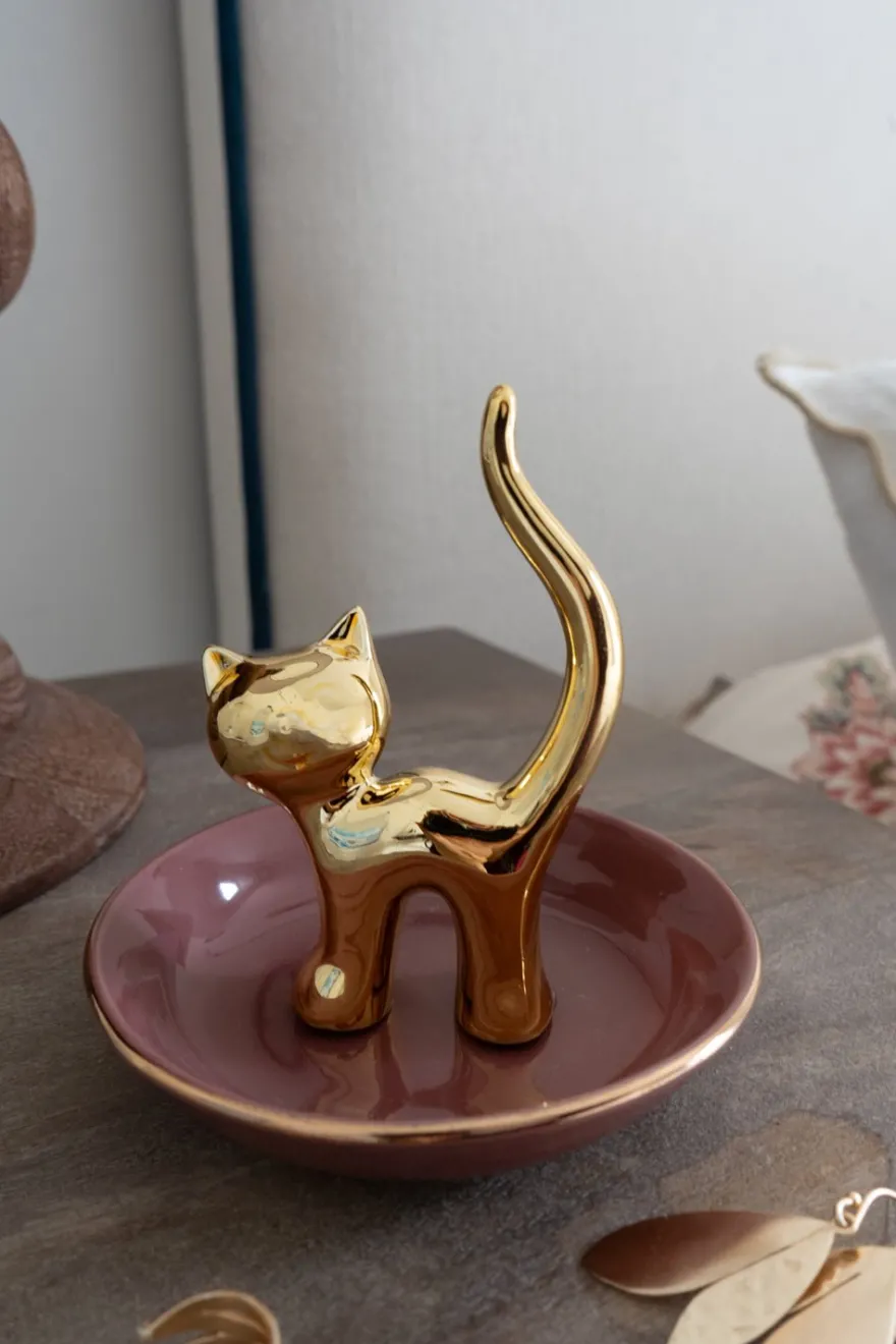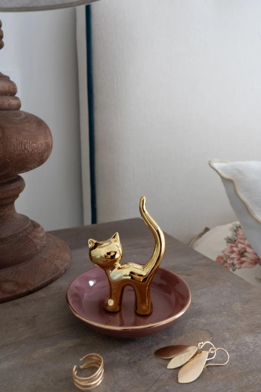 Porta anillos y joyas de cerámica con diseño de gato dorado que incluye una bandejita para tener organizadas las joyas .