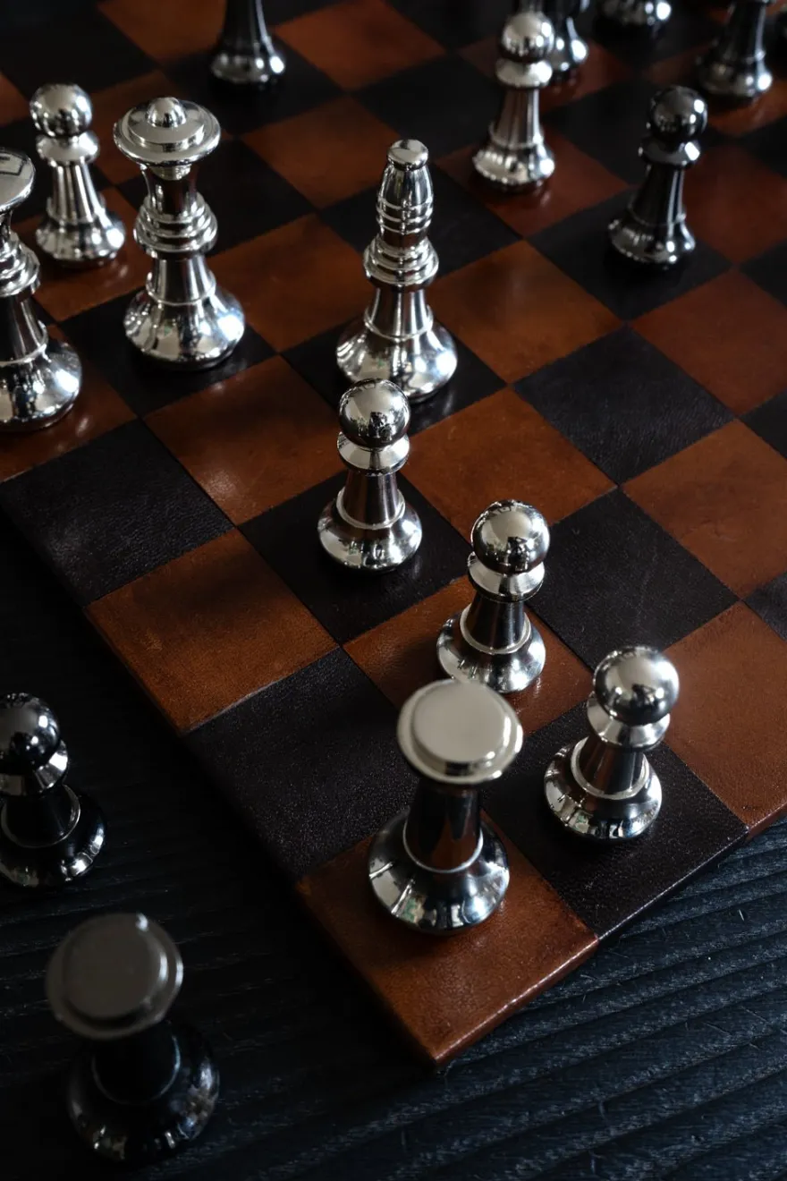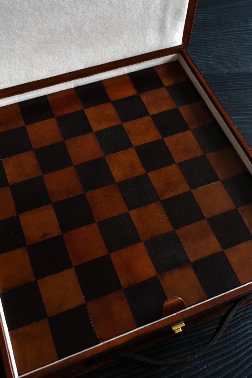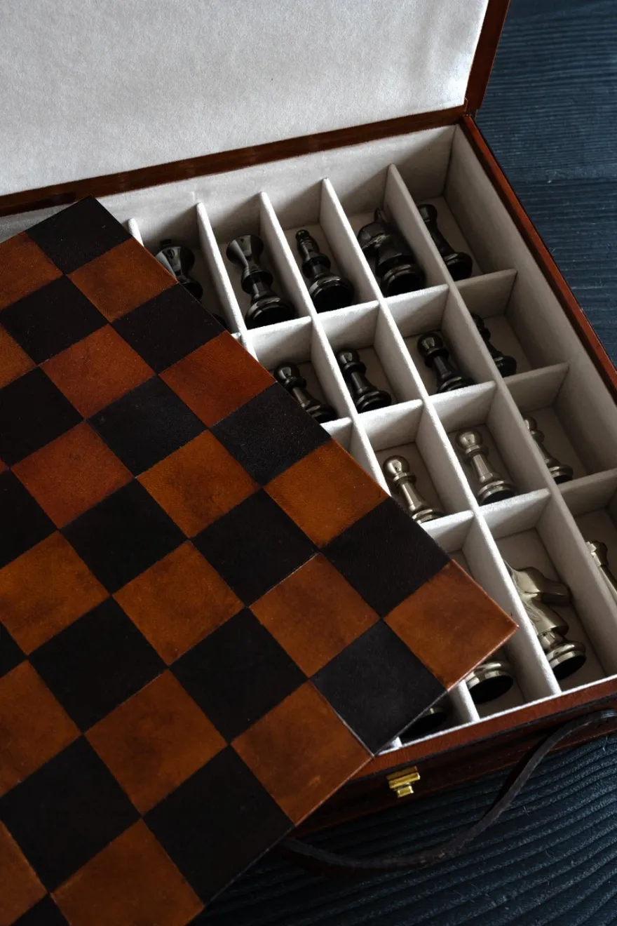 Elegante maletín de cuero con set completo de 32 piezas de ajedrez de aluminio y tablero de madera. Este conjunto es más que un juego, ya que además de transformar tus partidas de ajedrez en una experiencia verdaderamente especial, aporta elegancia y estilo a la decoración de cualquier rincón de casa.