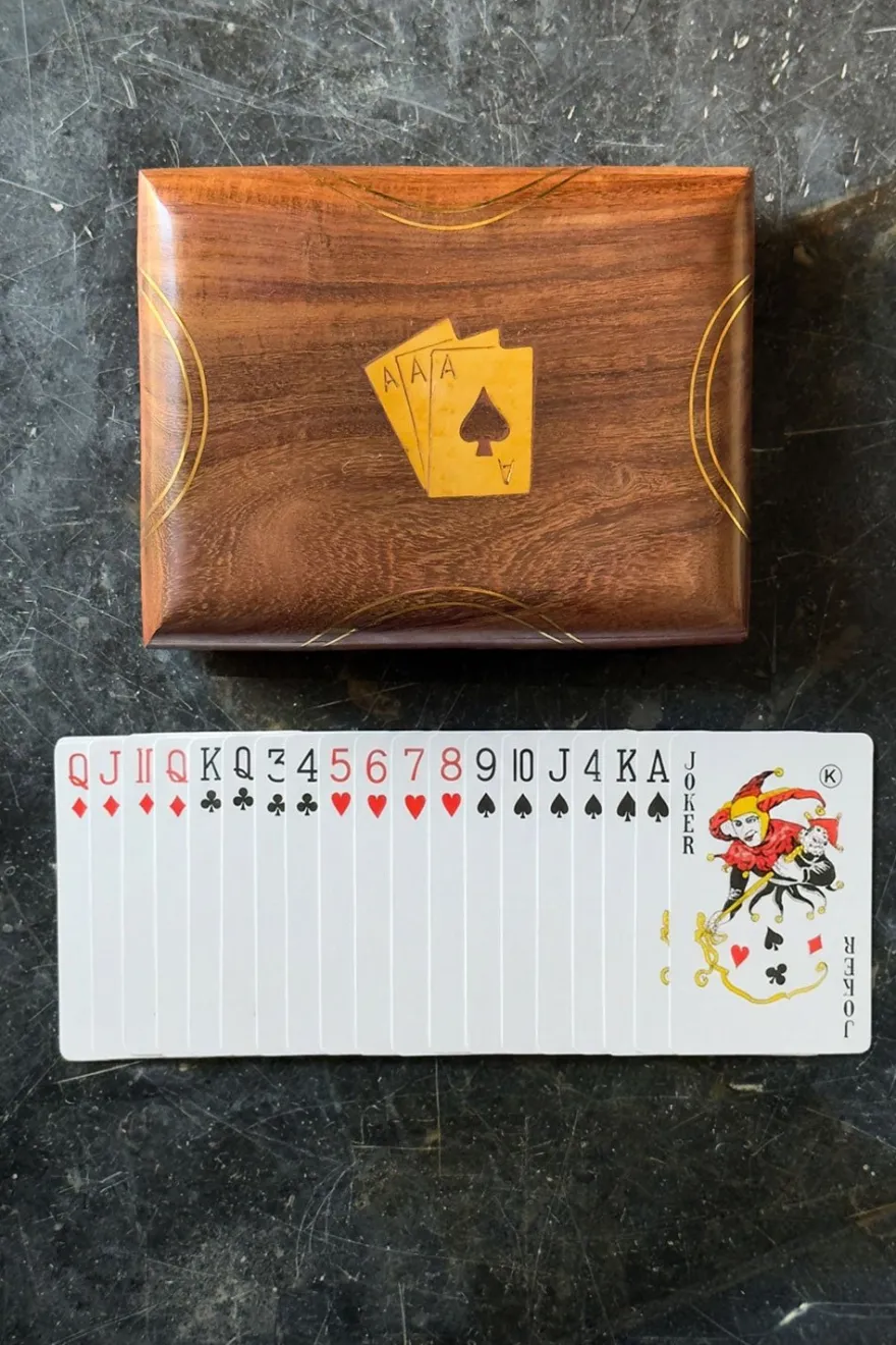 Set de dos barajas de cartas presentado en una elegante caja de madera de sheesham, conocida por su resistencia y vetas naturales. La tapa está decorada con cartas doradas, que aportan un toque distintivo y sofisticado. Ideal para juegos en casa, reuniones o como regalo especial, combina funcionalidad y diseño en una pieza decorativa.
