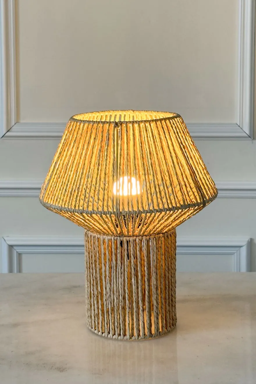 Lámpara de mesa decorativa con un elegante diseño de cuerdas verticales que crea una luz cálida y acogedora. Fabricada en papel trenzado, perfecta para colocar en mesas auxiliares, mesillas de noche o aparadores, aportando textura y estilo al espacio.