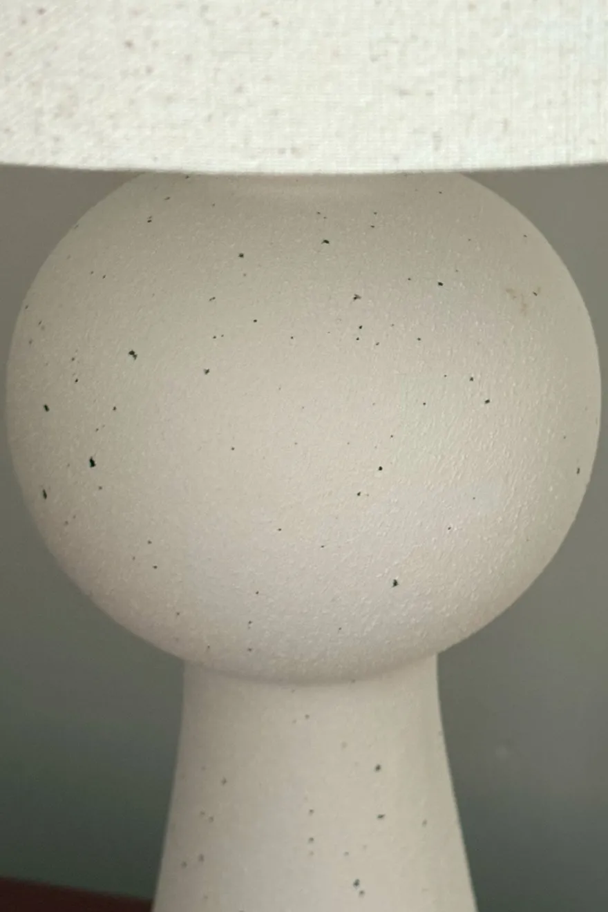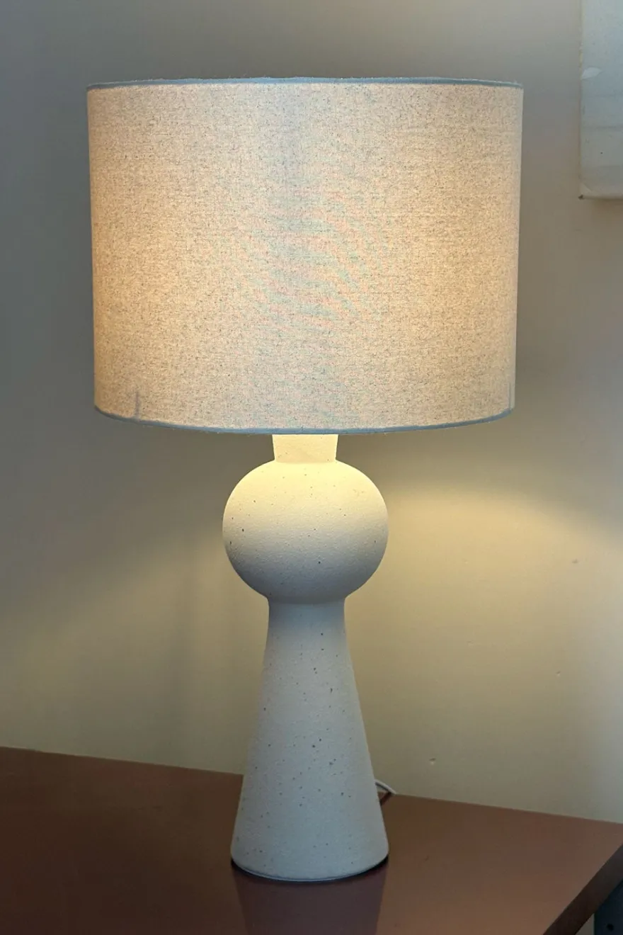 Lámpara de sobremesa de estilo minimalista fabricada en cerámica con acabado en tono natural, que aporta un toque sereno y elegante a cualquier espacio. Su base combina formas geométricas creando un diseño equilibrado y contemporáneo.