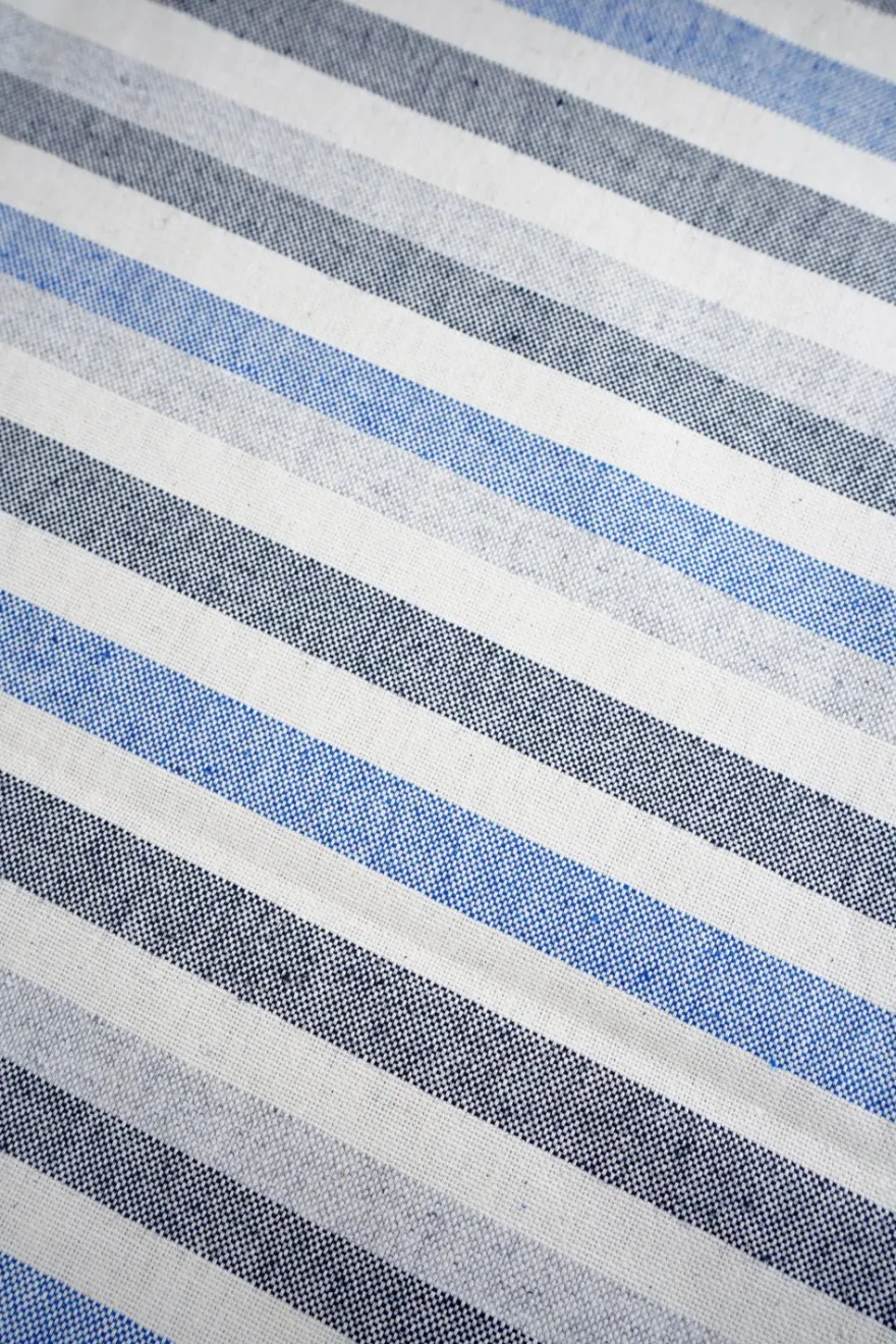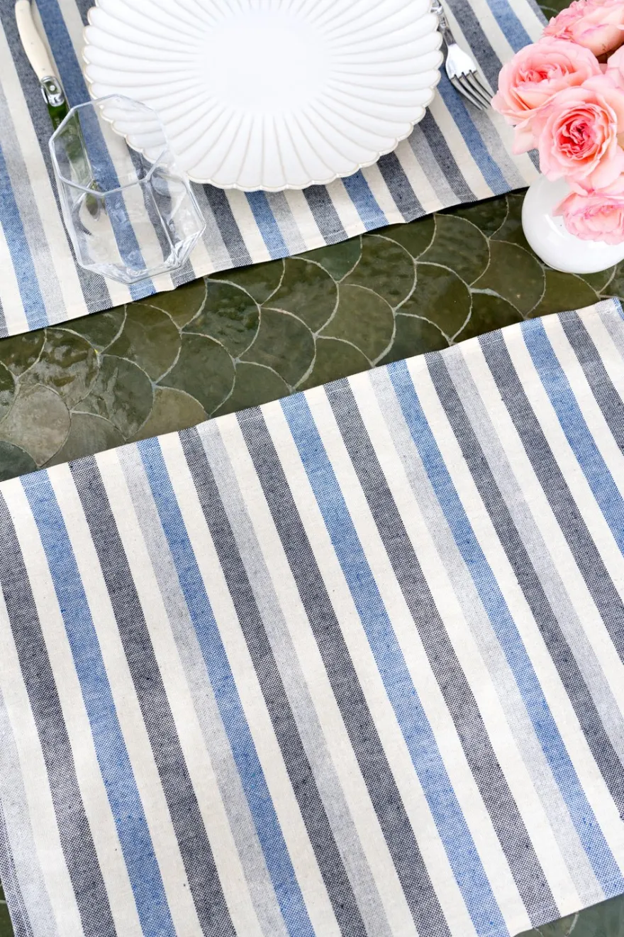 Manteles individuales con diseño de rayas azules y acabado con dobladillo, de 50% algodón y 50% poliéster, que ha sido tratado específicamente para repeler las manchas.