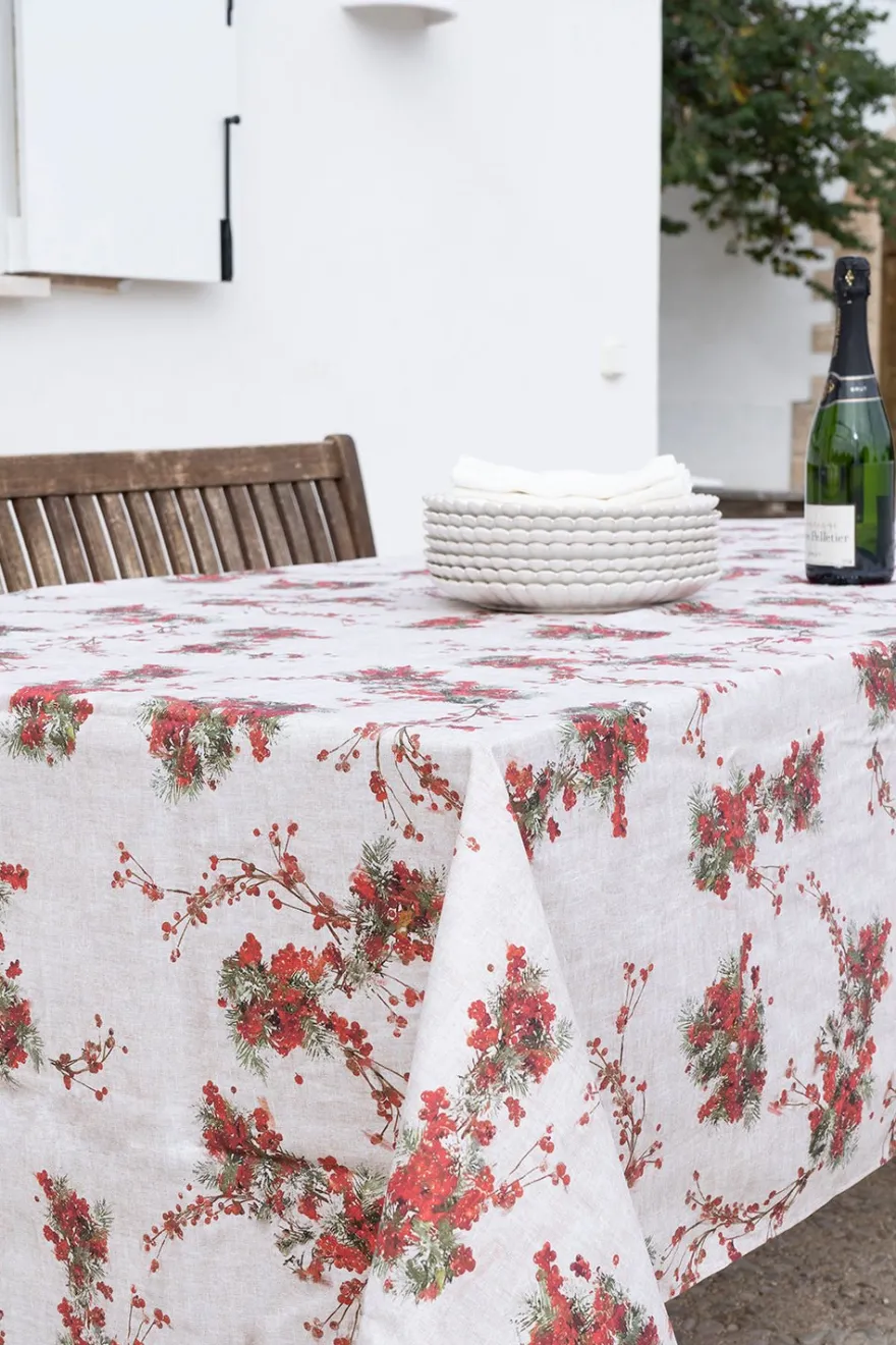 Mantel con diseño de acebo y acabado con dobladillo de 100% algodón que ha sido tratado específicamente para repeler las manchas.