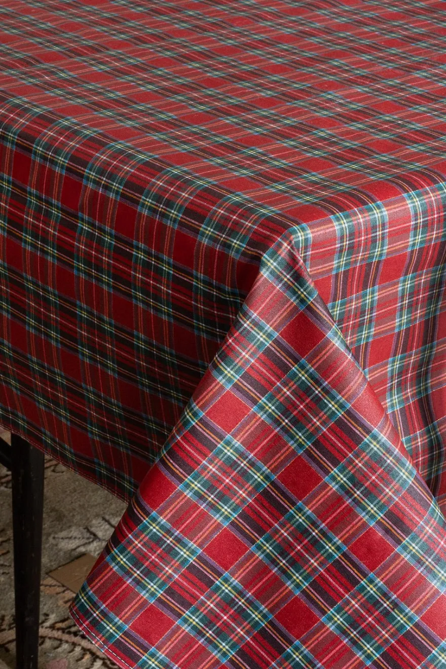 Mantel con diseño de cuadros escoceses que ha sido tratado específicamente para repeler las manchas.