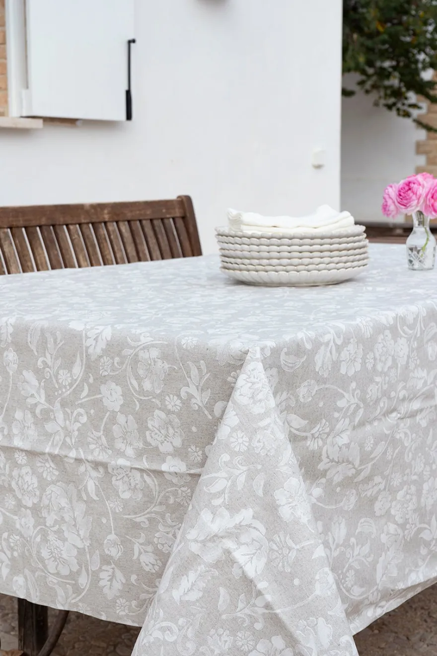 Mantel con diseño de flores blancas y acabado con dobladillo de tejido natural imitando al lino, de 80% algodón y 20% poliéster que ha sido tratado específicamente para repeler las manchas.