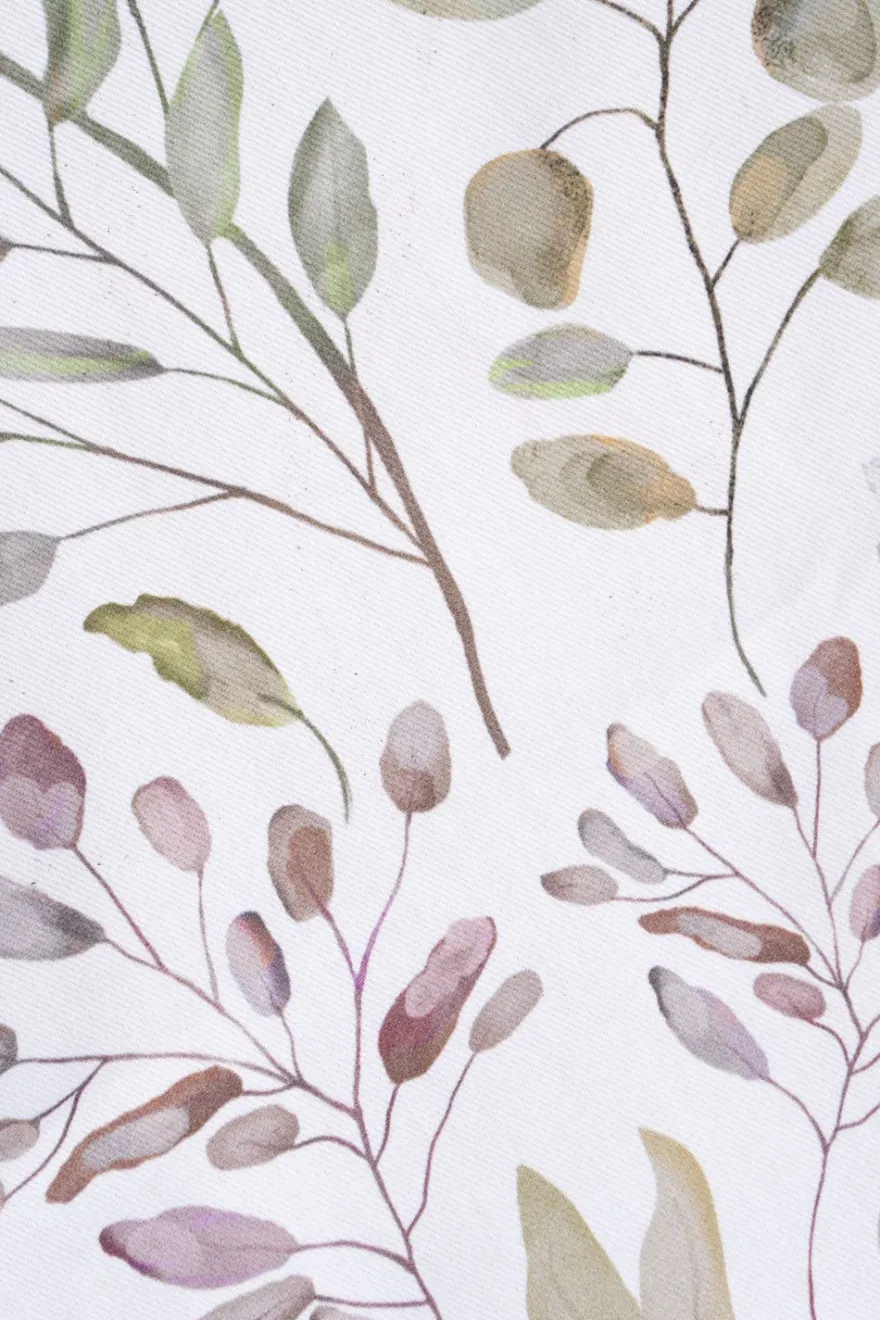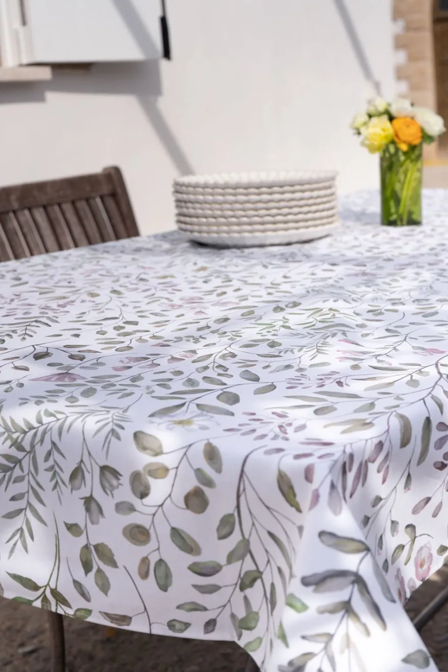 Mantel con diseño jazmín y acabado con dobladillo de 100% algodón que ha sido tratado específicamente para repeler las manchas.
