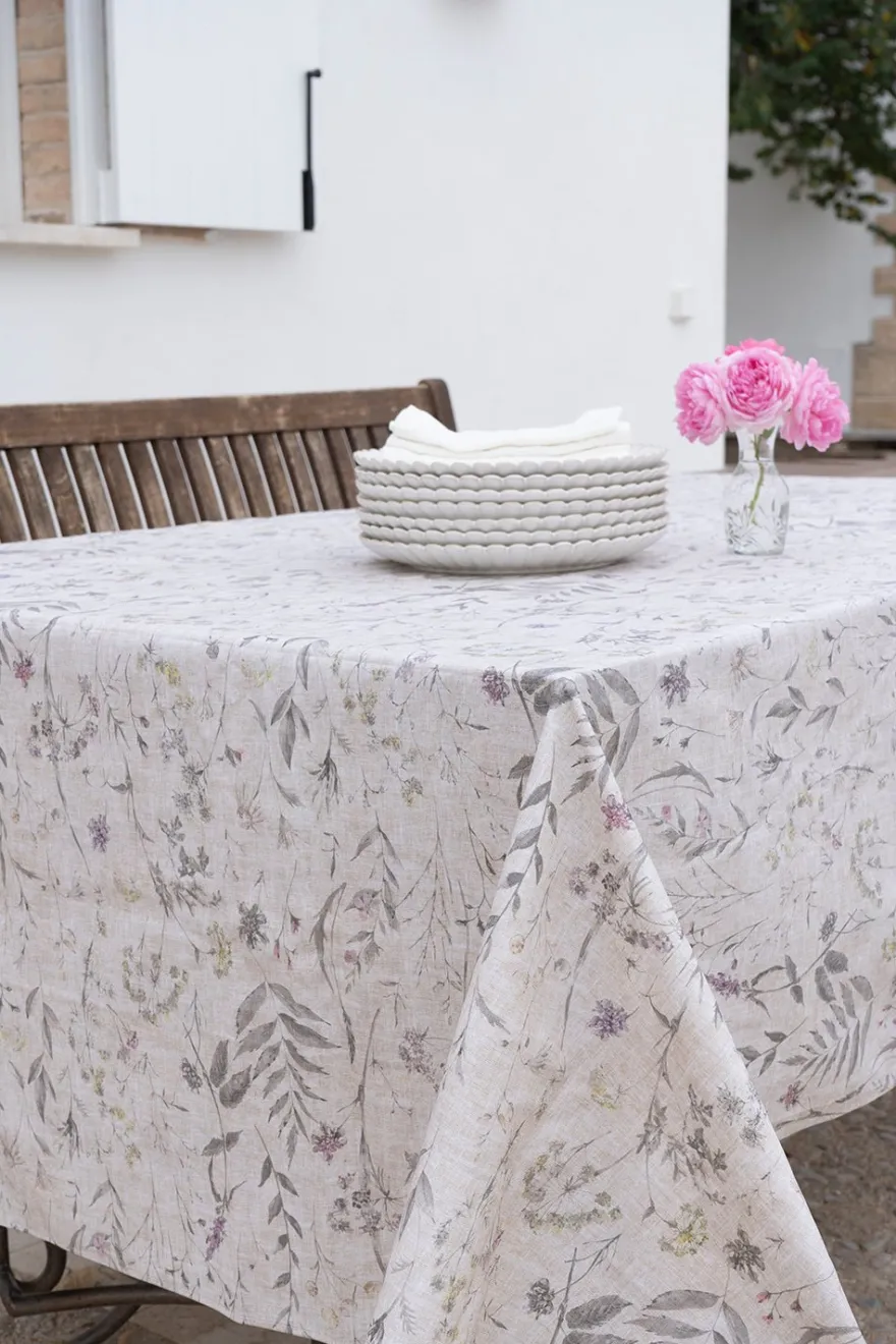 Mantel con diseño lavanda y acabado con dobladillo de 100% algodón que ha sido tratado específicamente para repeler las manchas.