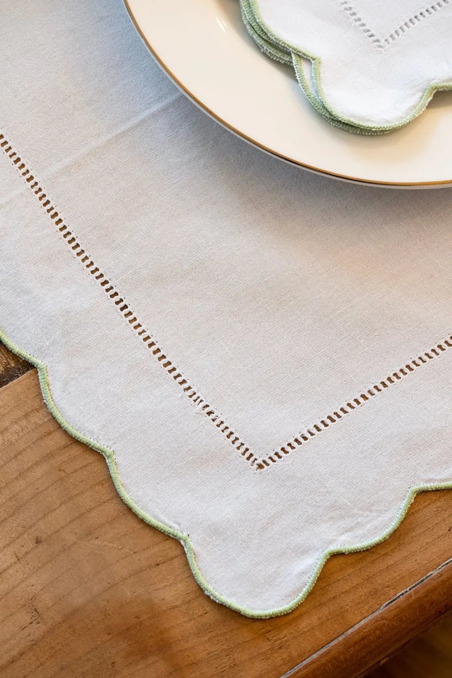 Individual de hilo de algodón liso en color blanco con detalle de vainica y borde ondulado, disponible en remate de color negro y verde.