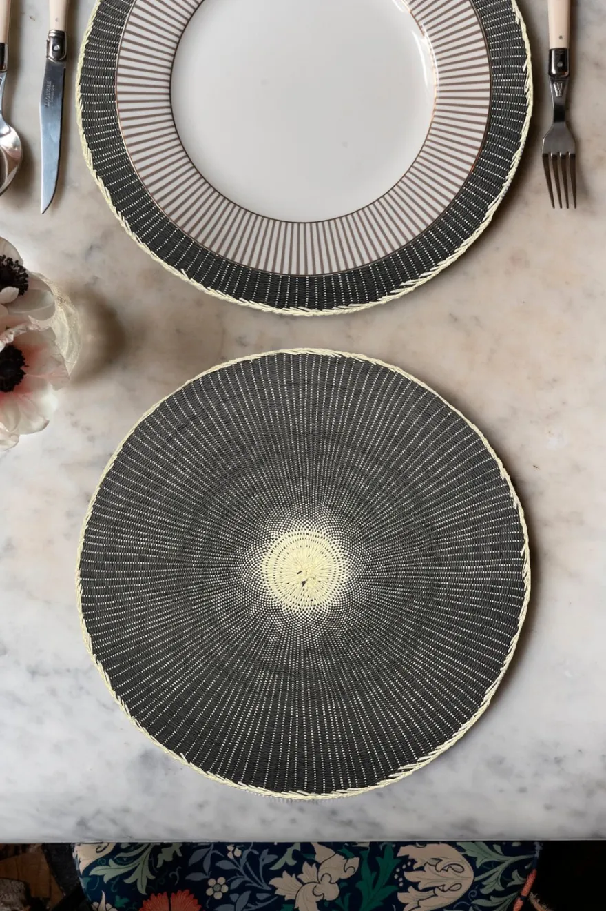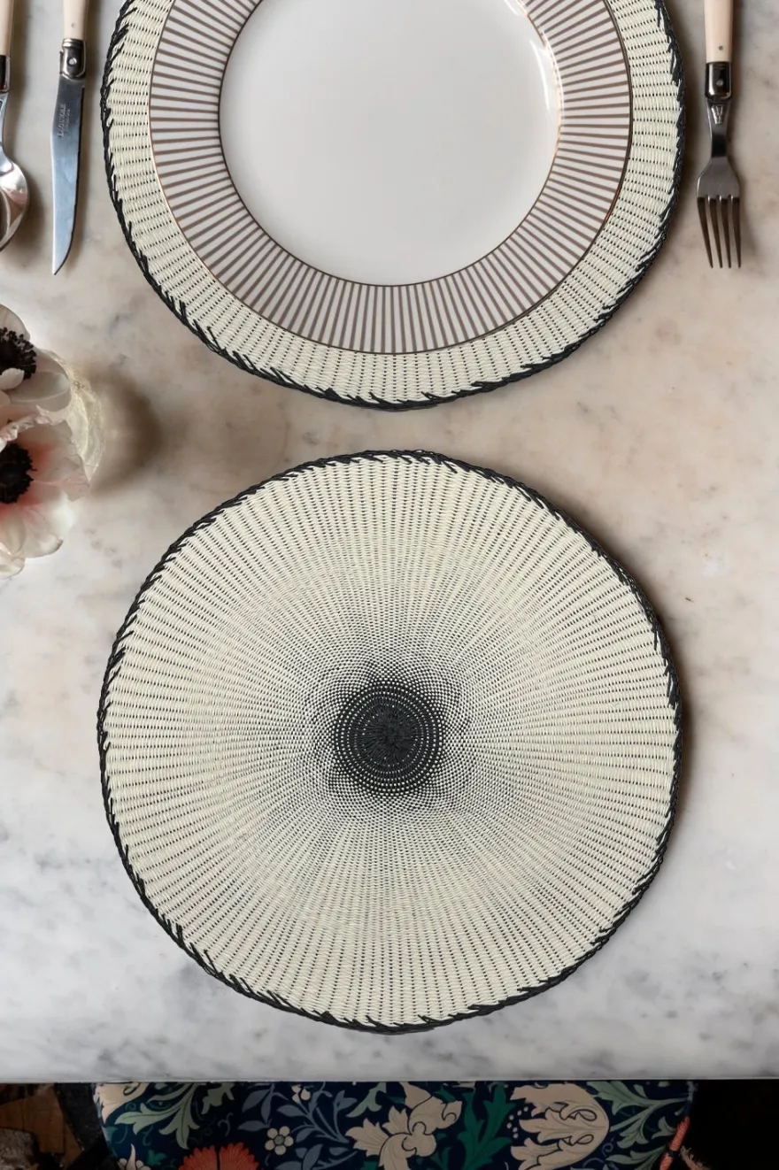 Mantel individual redondo de rafia en tonalidades blancas y negras, ideal para complementar tus mesas tanto en interiores como en exteriores. Puedes combinarlo con nuestra vajilla blanca y negra.