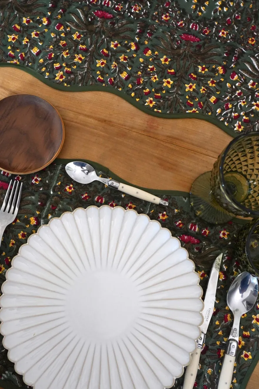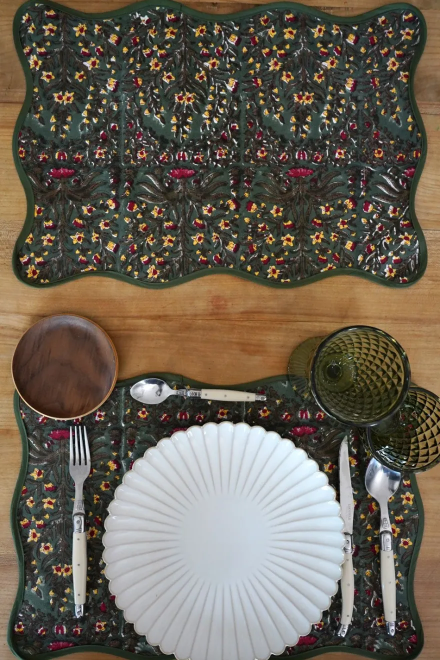 Mantel individual de 100% algodón con borde ondulado y diseño de flores verdes pintado a mano en la India. Perfecto para celebraciones, comidas al aire libre o simplemente para alegrar el día a día.