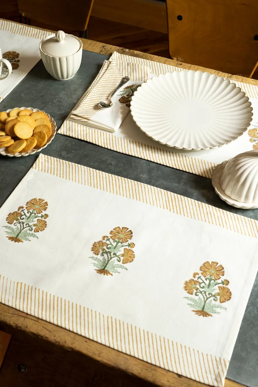 Mantel individual 100% algodón con diseño Kalinda, cuyo significado es “Sol”, pintado a mano en la India.