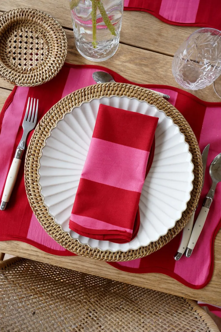 Mantel individual de 100% algodón con borde ondulado y diseño de rayas rosas y rojas pintado a mano en la India. Perfecto para celebraciones, comidas al aire libre o simplemente para alegrar el día a día.