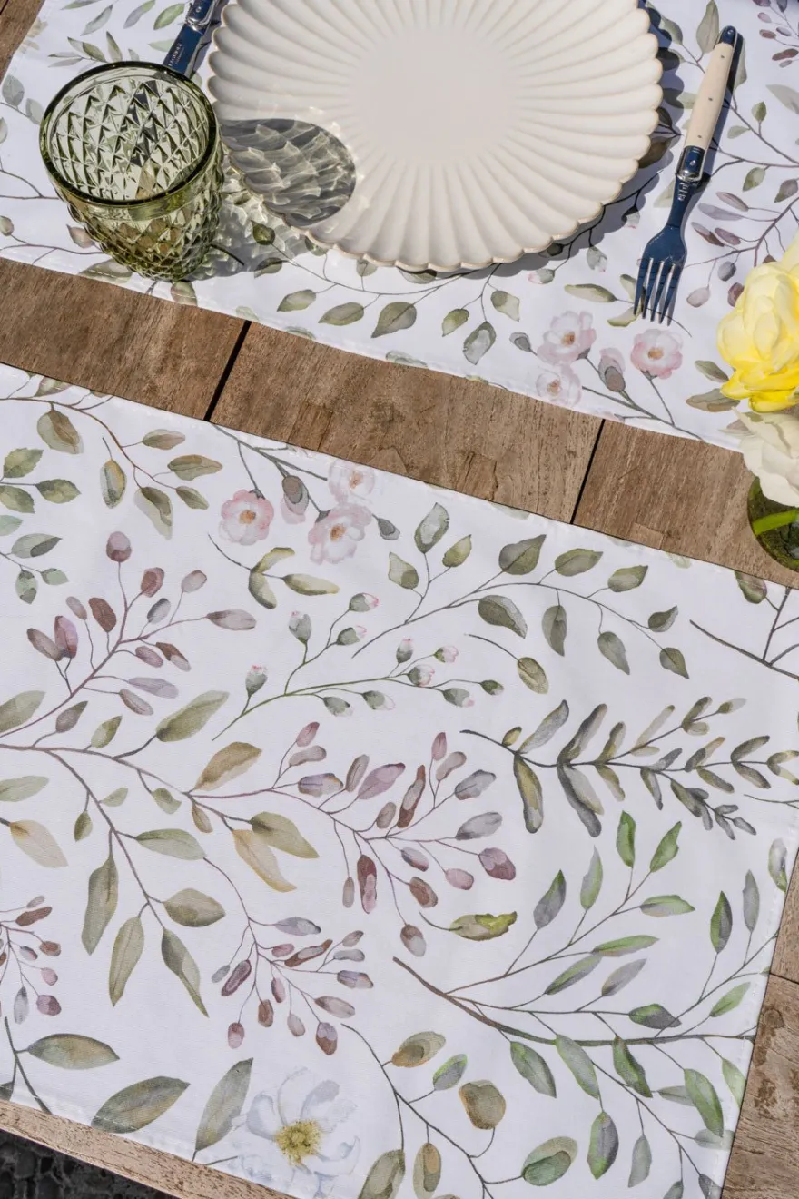 Manteles con diseño jazmín y acabado con dobladillo de 100% algodón que ha sido tratado específicamente para repeler las manchas.