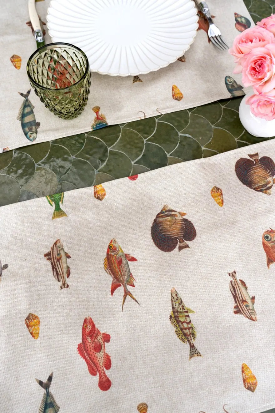 Manteles individuales con diseño de peces y acabado con dobladillo, de 80% algodón y 20% poliéster, que ha sido tratado específicamente para repeler las manchas.