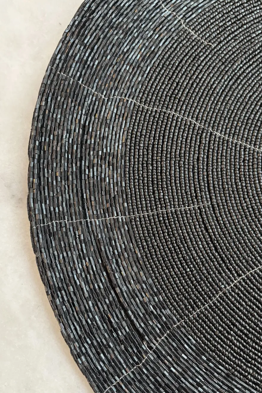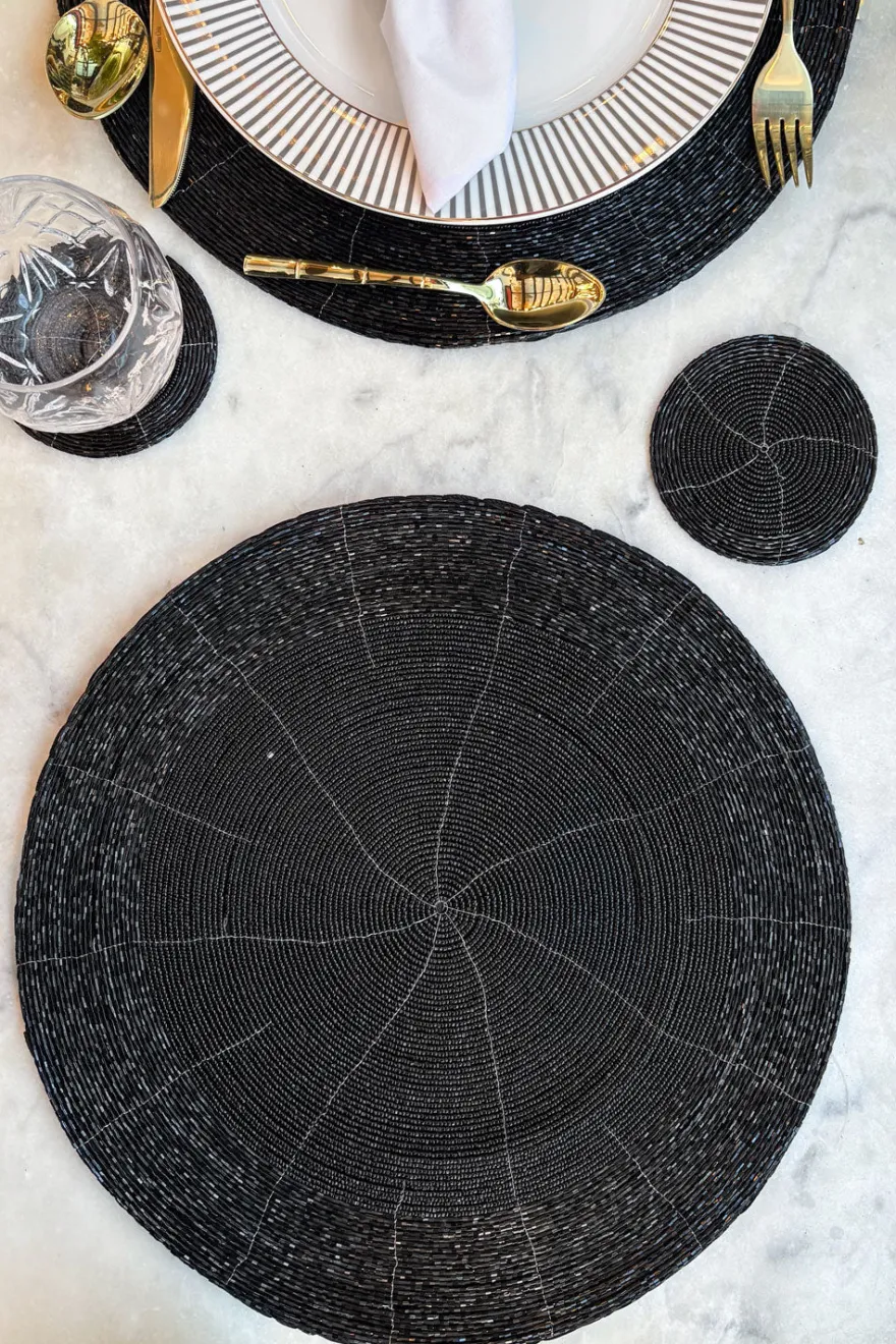 Este mantel individual o bajoplato destaca por su exquisito bordado a mano, elaborado con finas cuentas negras que aportan un toque de lujo adicional. Cada bolita está cuidadosamente cosida formando patrones delicados que crean una combinación única de textura, relieve y elegancia artística. Su diseño sofisticado transforma cualquier mesa, haciéndolo ideal tanto para cenas especiales como para elevar la decoración del día a día.