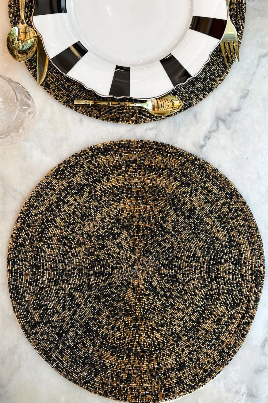 Este mantel individual o bajoplato destaca por su exquisito bordado a mano, elaborado con finas cuentas negras y doradas que aportan un toque de lujo adicional. Cada bolita está cuidadosamente cosida formando patrones delicados que crean una combinación única de textura, relieve y elegancia artística. Su diseño sofisticado transforma cualquier mesa, haciéndolo ideal tanto para cenas especiales como para elevar la decoración del día a día.
