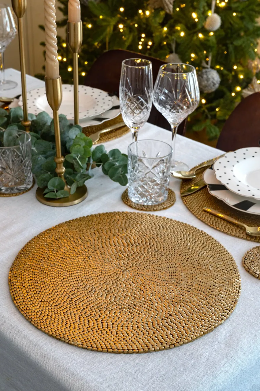 Este mantel individual o bajoplato destaca por su exquisito bordado a mano con hilo dorado, que le da un toque de lujo y sofisticación a cualquier mesa. Perfecto para cenas especiales o para elevar la decoración diaria de tu mesa.