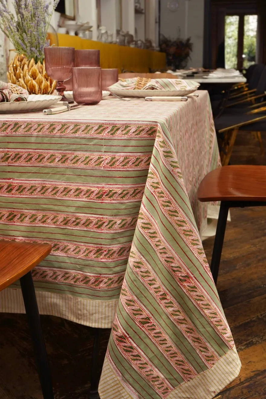 Mantel 100% algodón con diseño Hara, en tonos verdes, rojos y ocres, pintado a mano en la India.