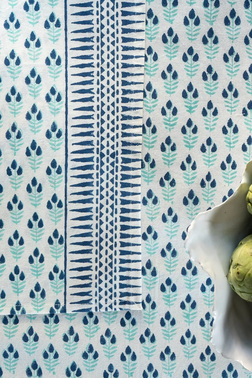 Mantel 100% algodón con diseño Mira, cuyo significado es “Océano”, pintado a mano en la India.