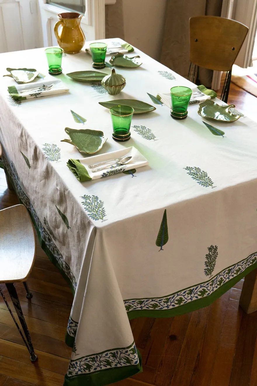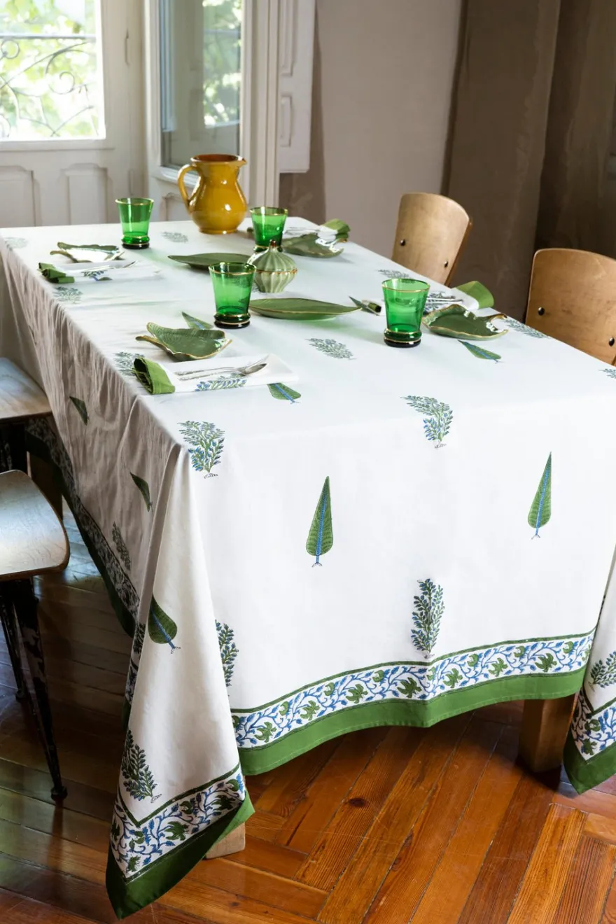 Mantel 100% algodón con diseño Saniya, cuyo significado es “Radiante”, pintado a mano en la India.