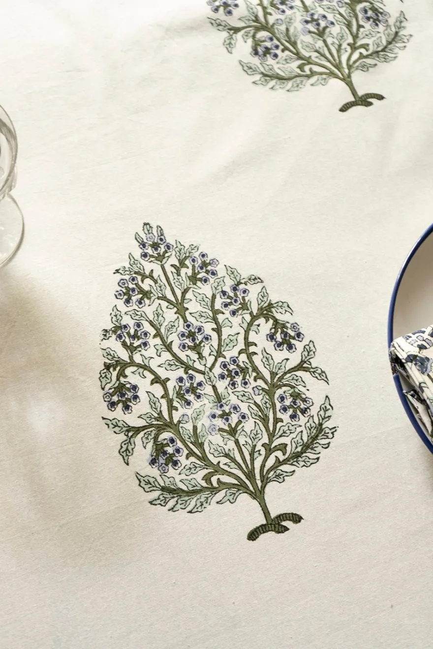 Mantel 100% algodón con diseño Shanta, cuyo significado es “Pacífica”, pintado a mano en la India.