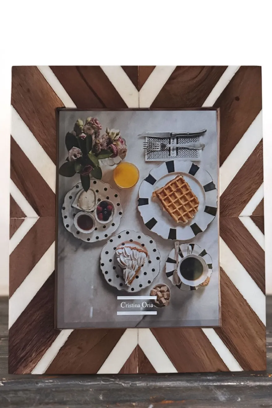 Marco de fotos de madera con diseño de rayas en colores blancas y marrones, ideal para decorar cualquier rincón de tu casa durante cualquier época del año.