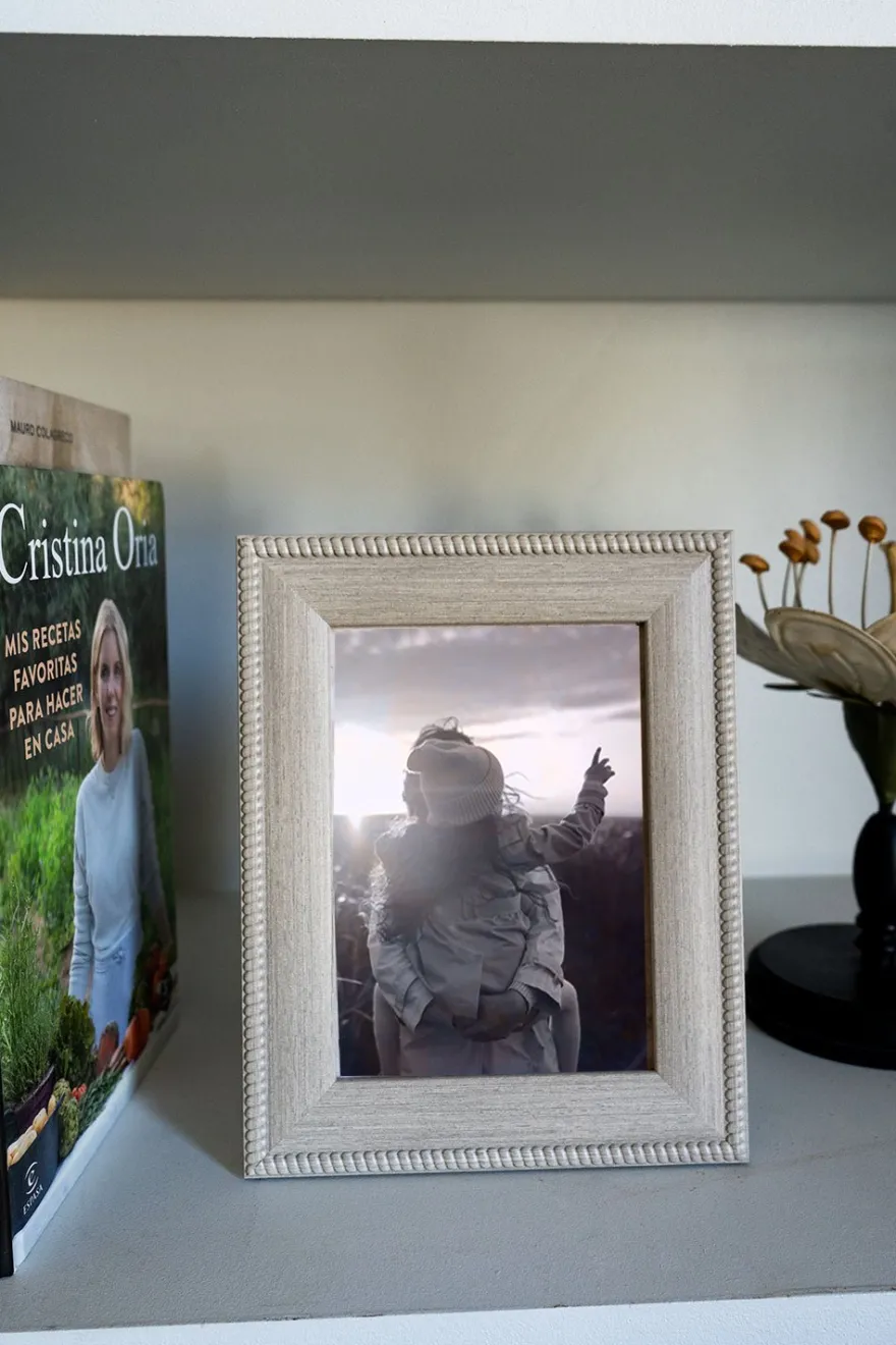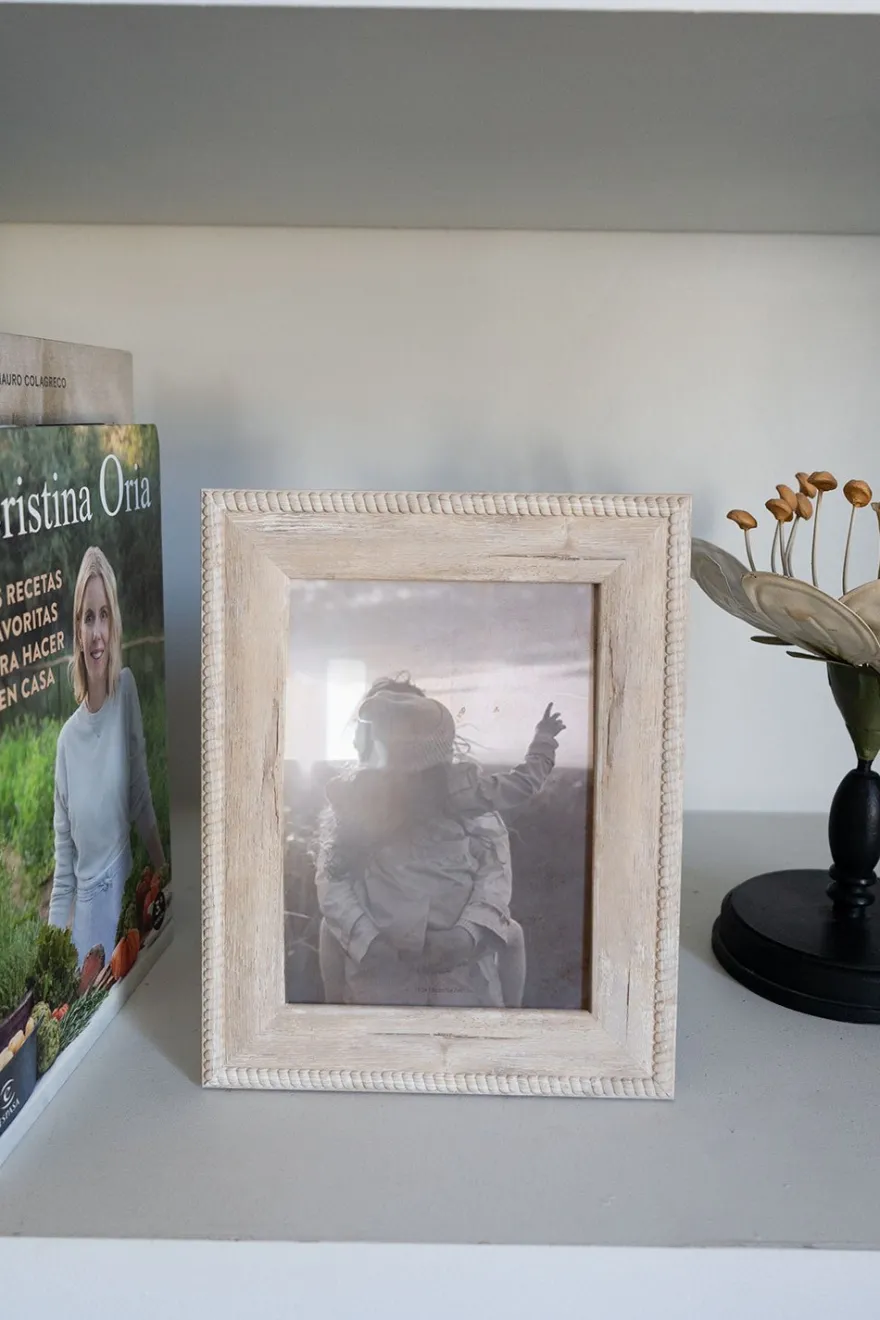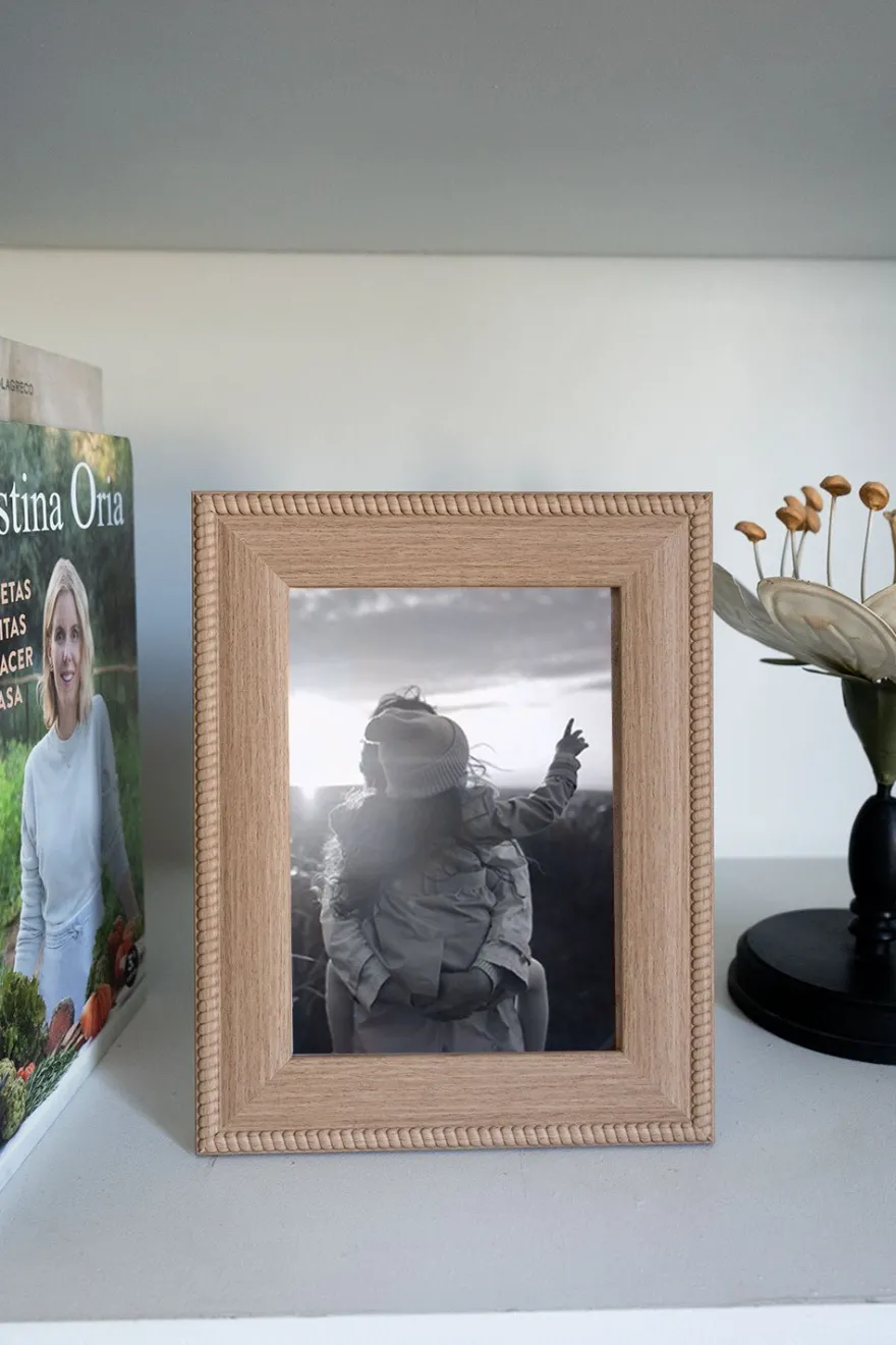 Marco de fotos o portarretratos con borde de madera y detalle en relieve, ideal para decorar cualquier rincón de tu casa.