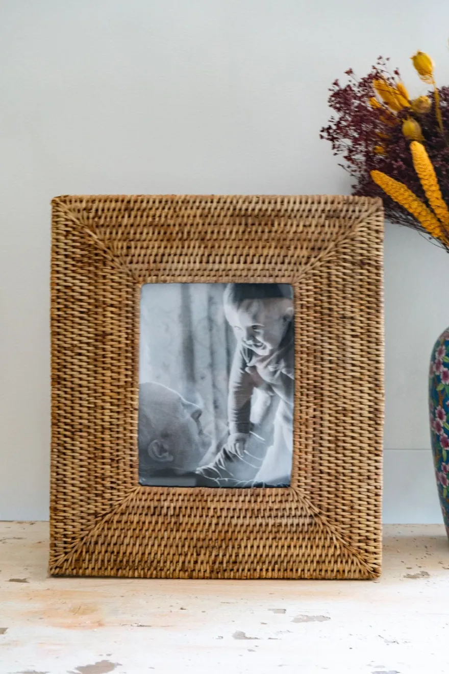 Marco de fotos de ratán en color marrón natural, ideal para decorar cualquier rincón de tu casa durante cualquier época del año.