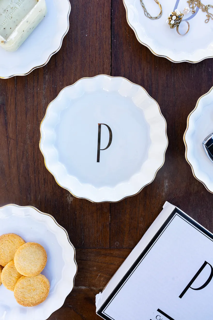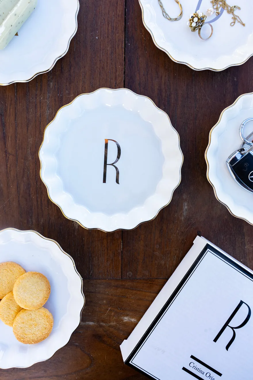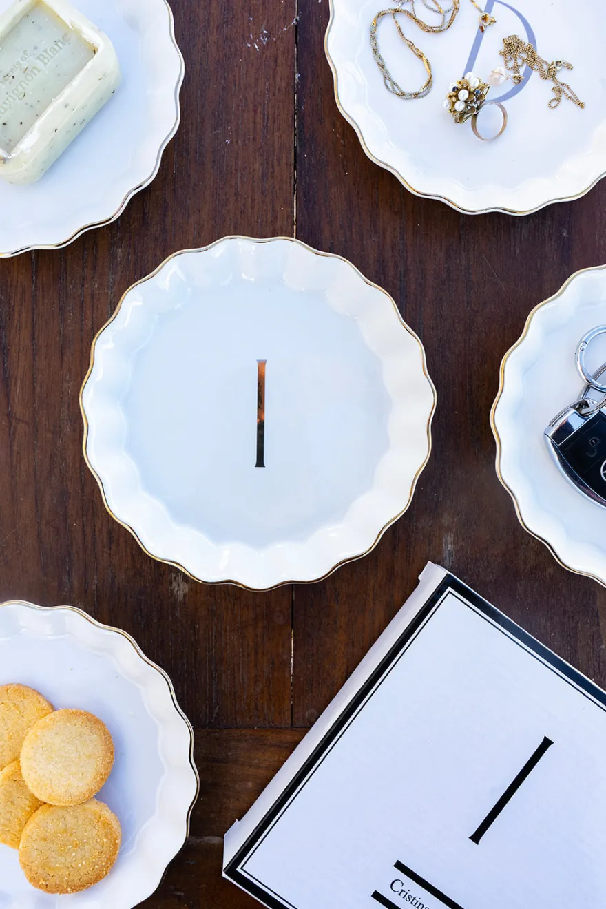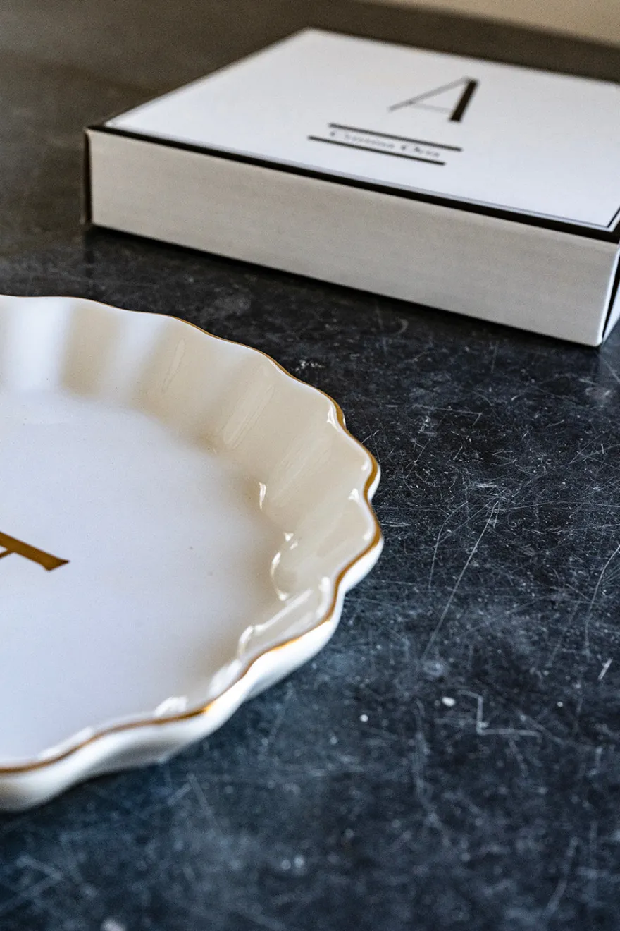 Bandejita redonda con borde ondulado y delicado filo dorado, personalizada con inicial, de new bone china con diseño propio Cristina Oria.