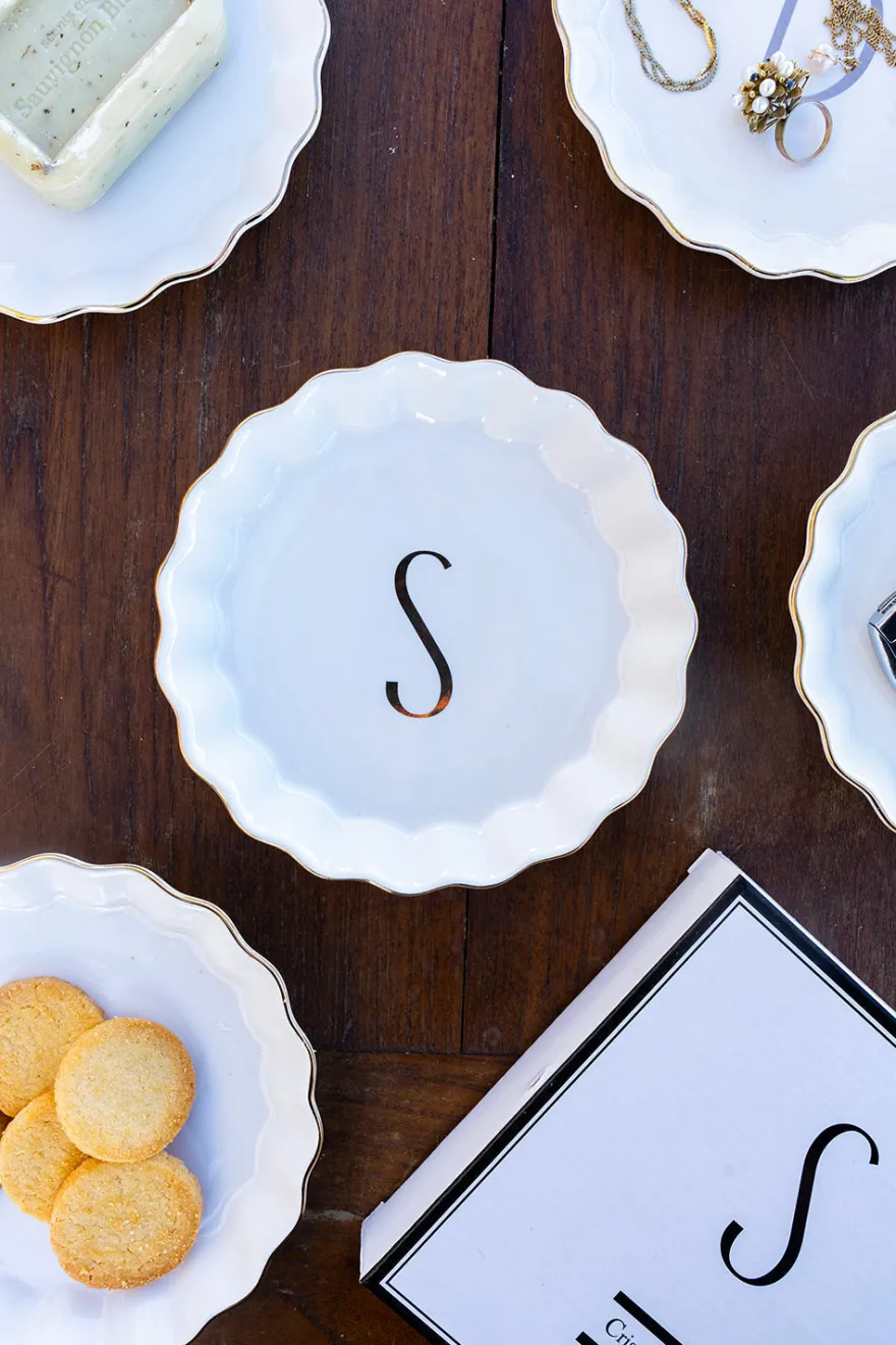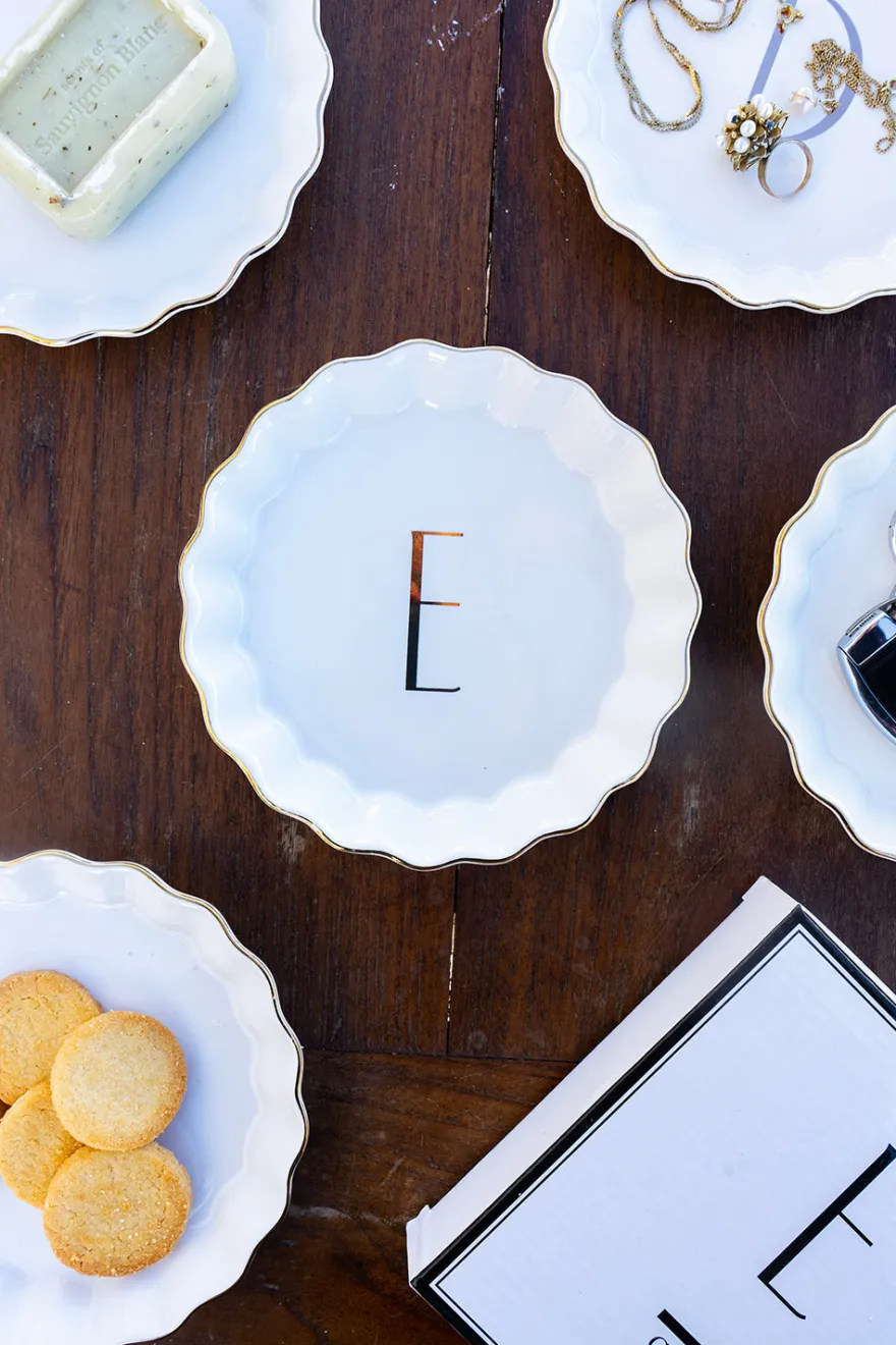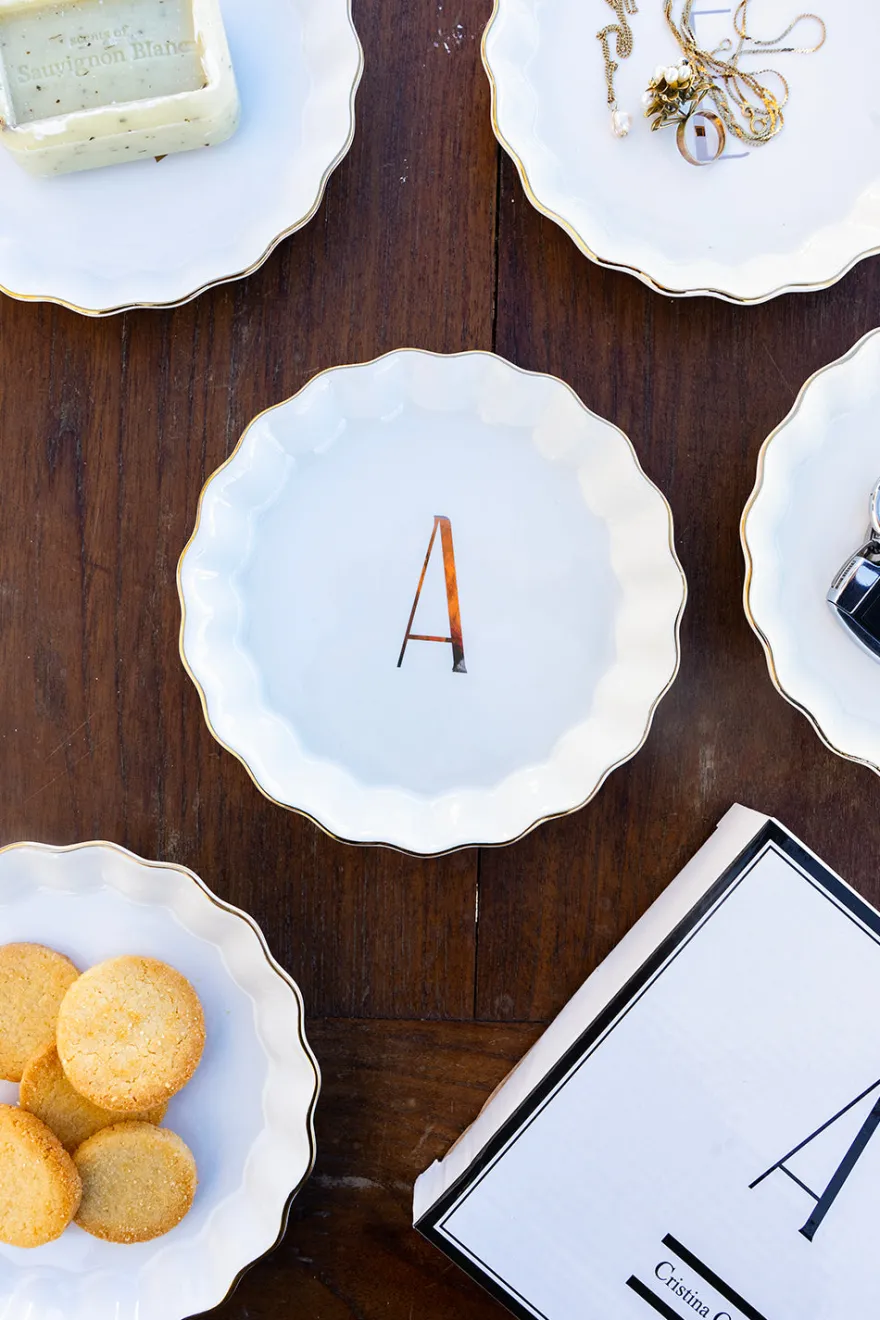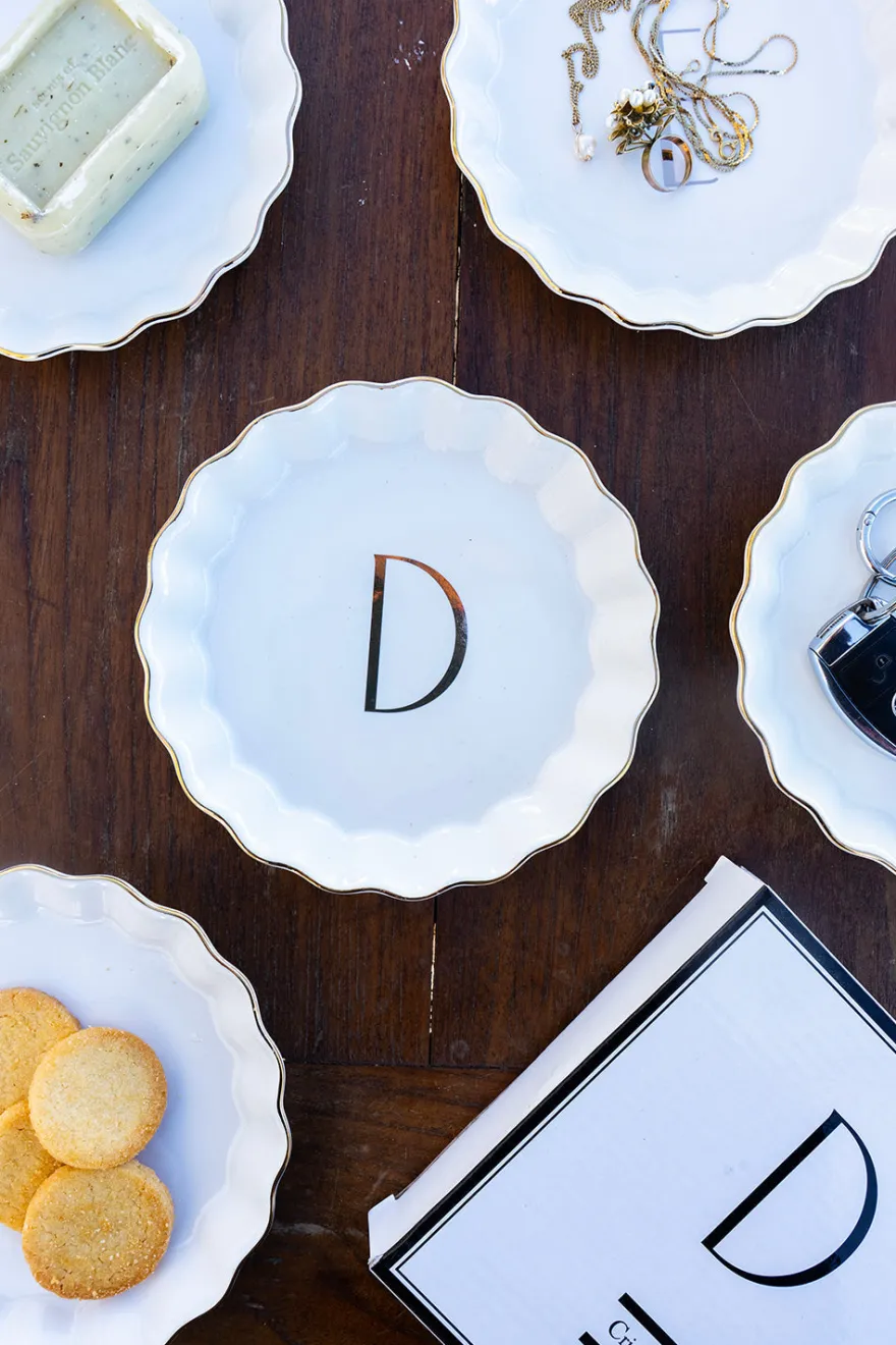 Bandejita redonda con borde ondulado y delicado filo dorado, personalizada con inicial, de new bone china con diseño propio Cristina Oria.