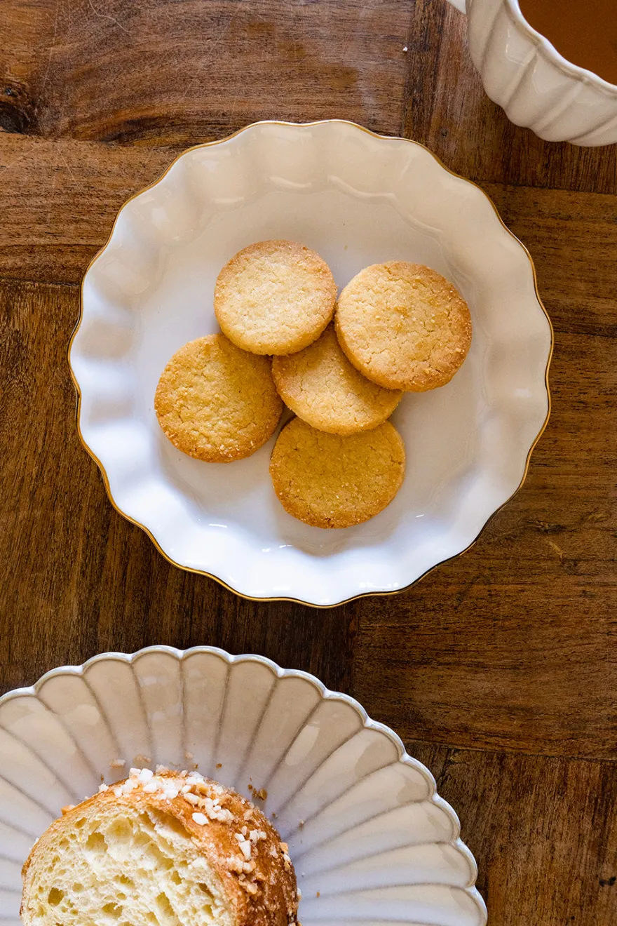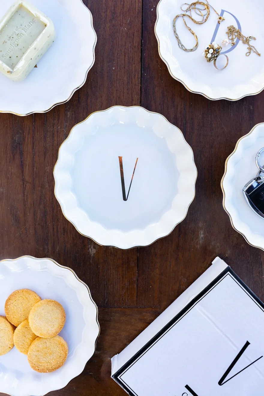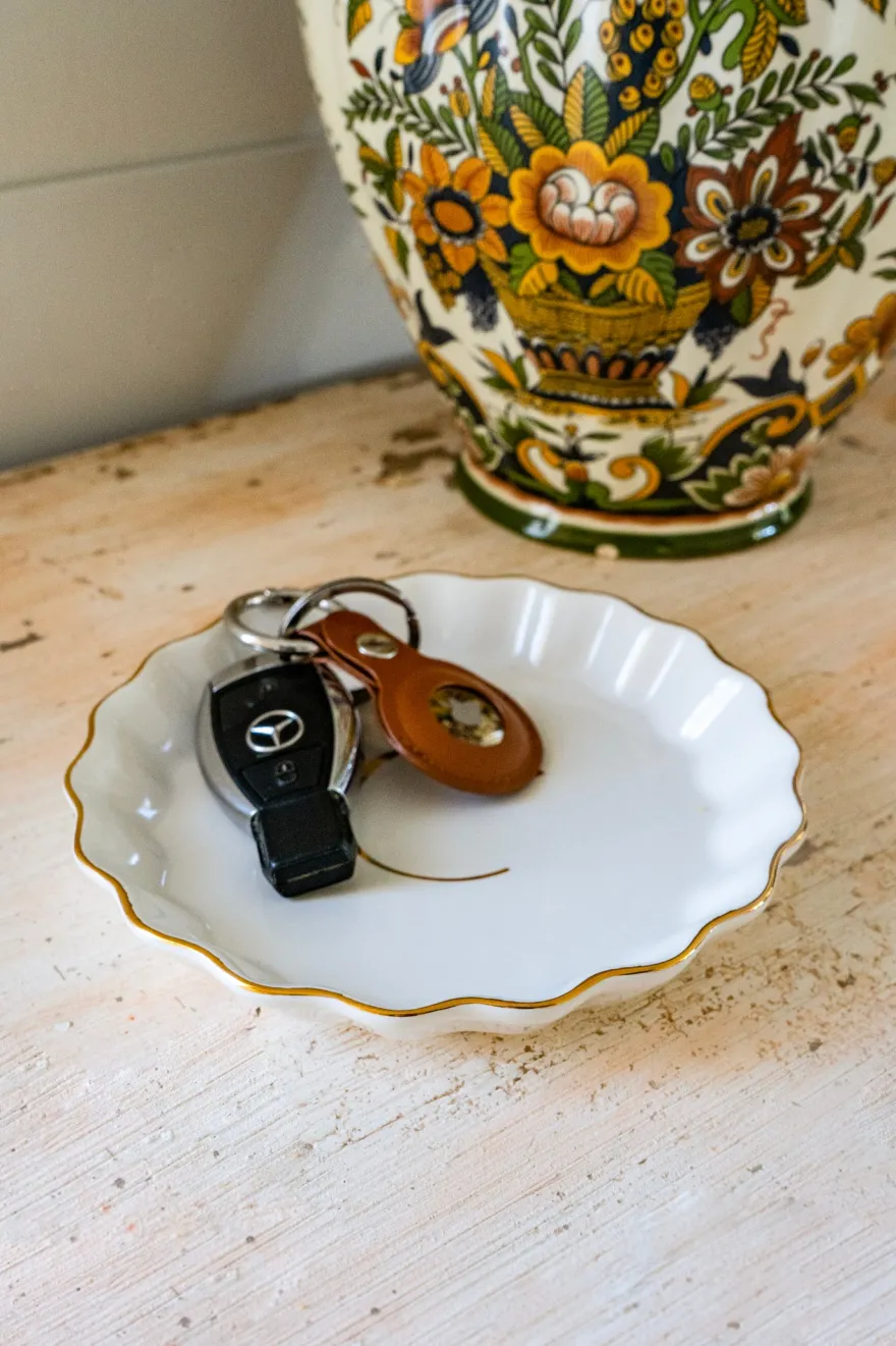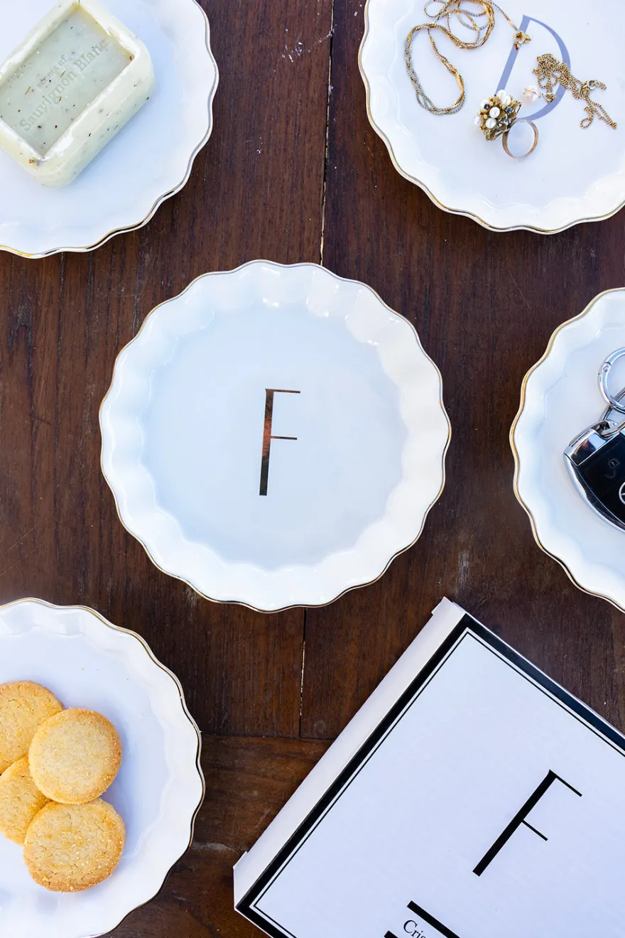 Bandejita redonda con borde ondulado y delicado filo dorado, personalizada con inicial, de new bone china con diseño propio Cristina Oria.