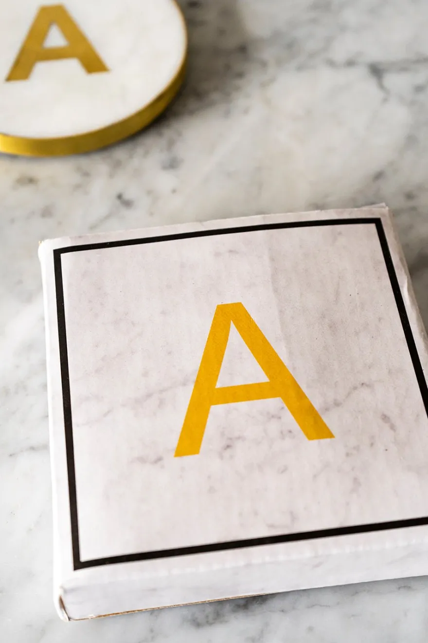 Posavaso de mármol con inicial, con diseño propio de Cristina Oria.