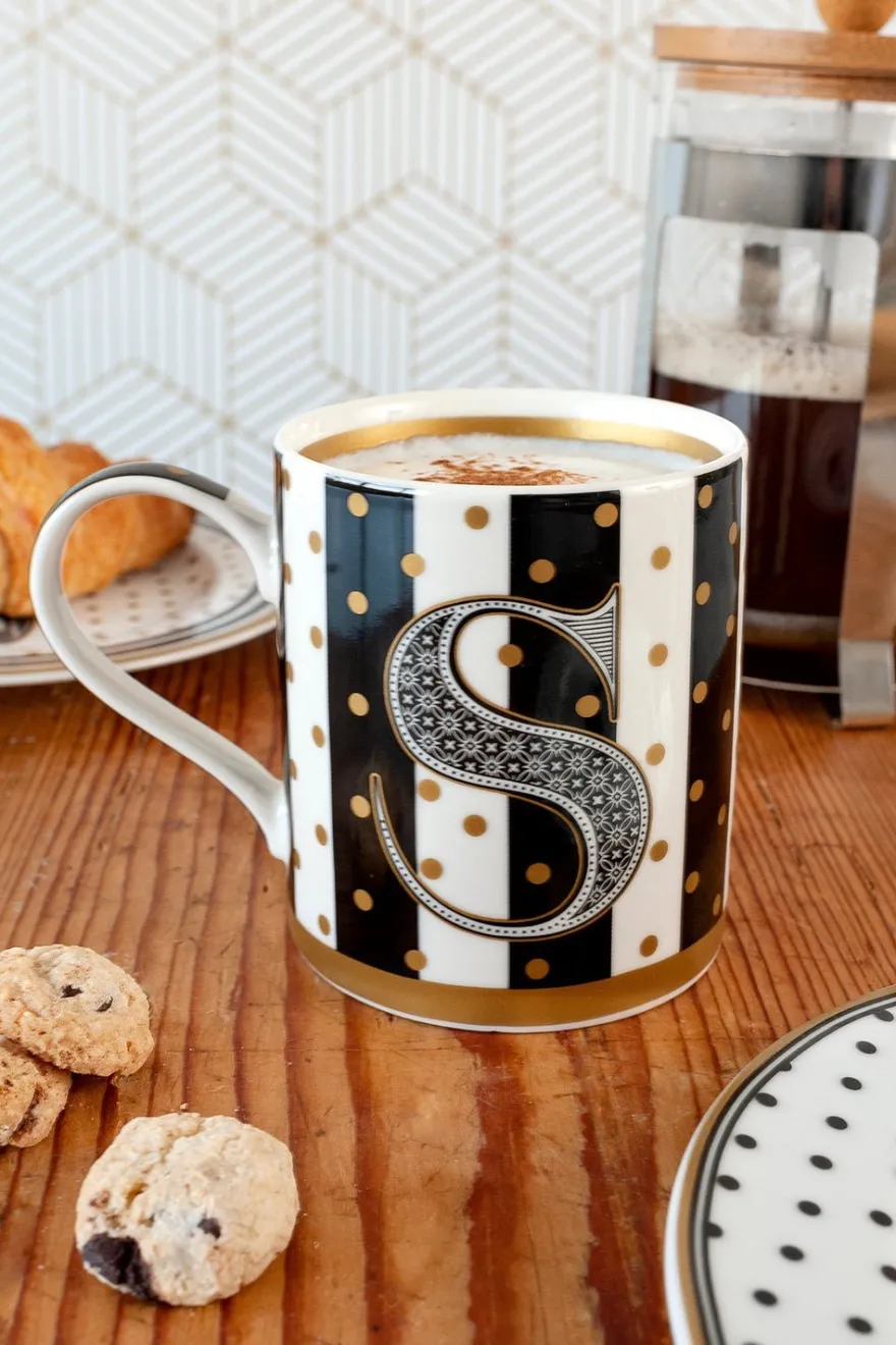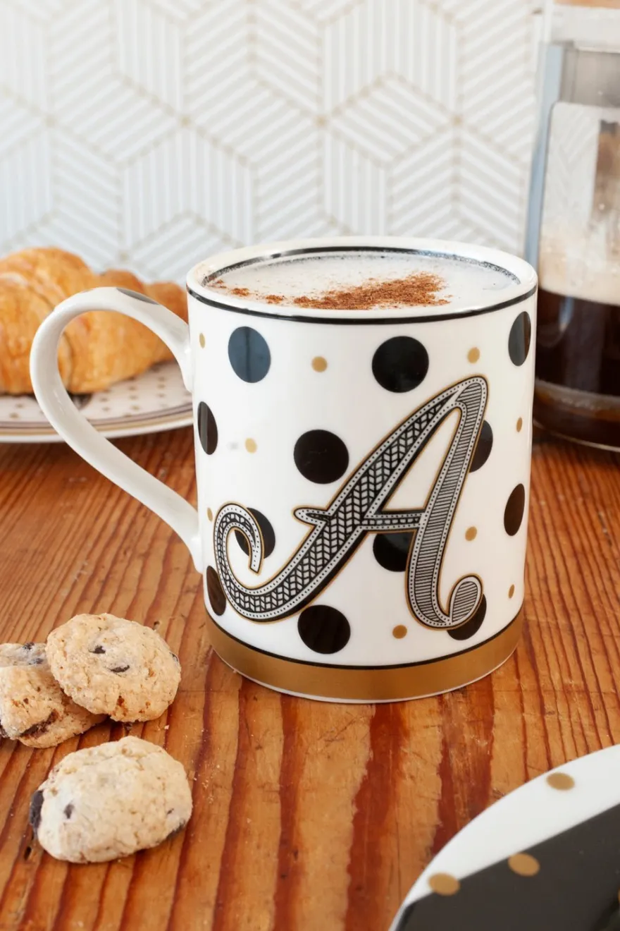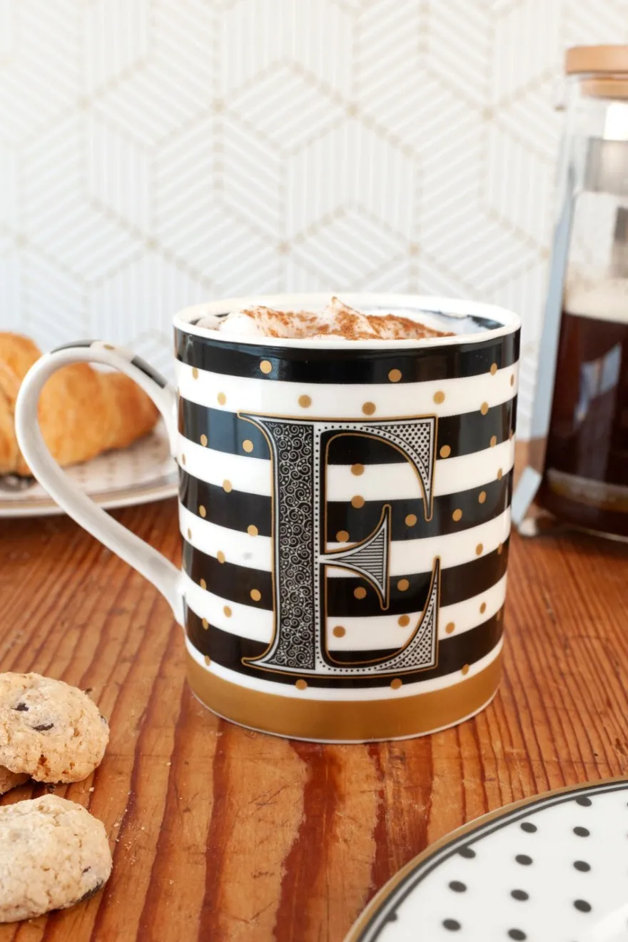 – Taza de porcelana personalizada con inicial (a escoger) en colores blancos y negros, y detalles dorados. Viene en su cajita de cartón con la inicial
