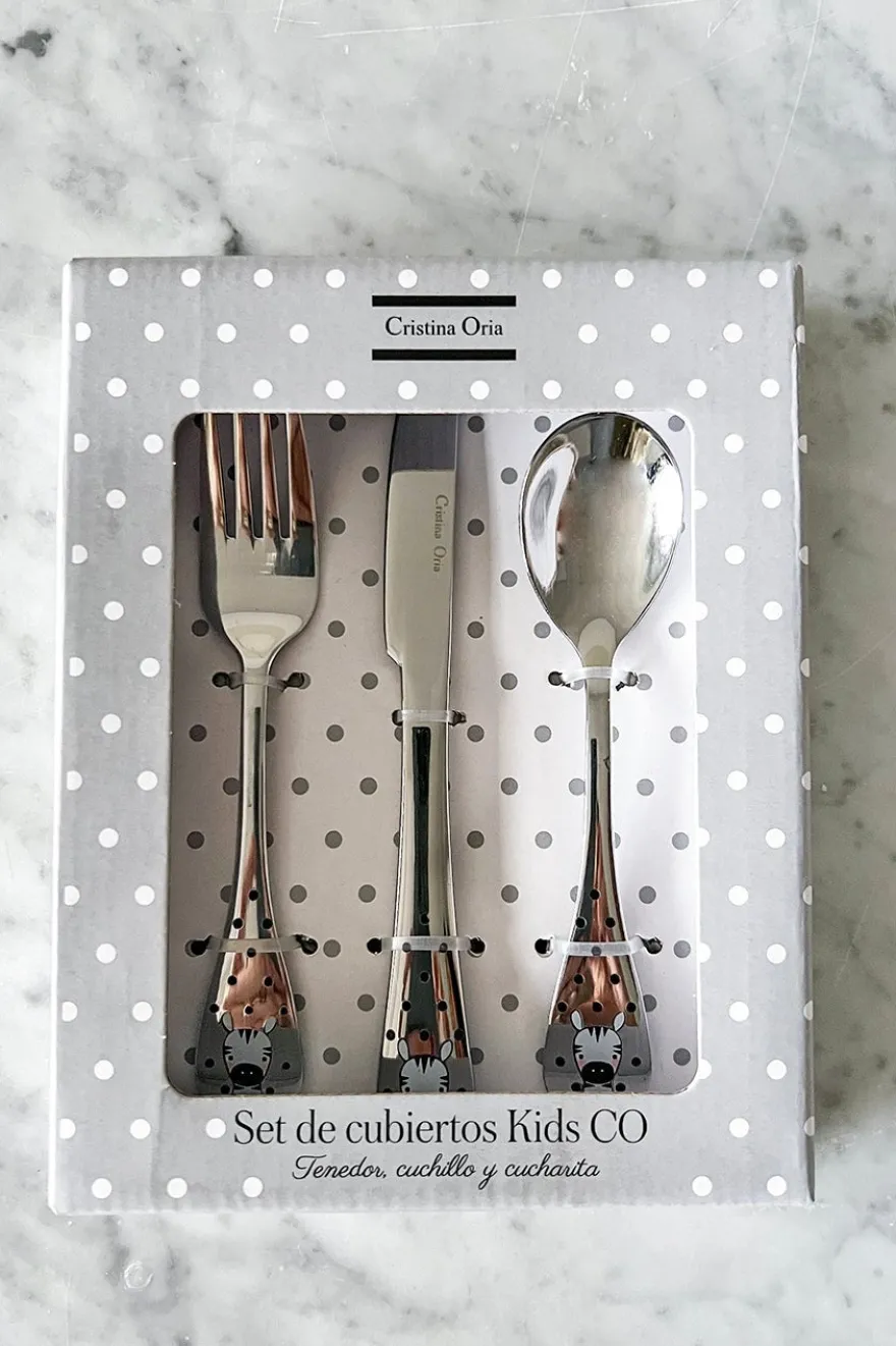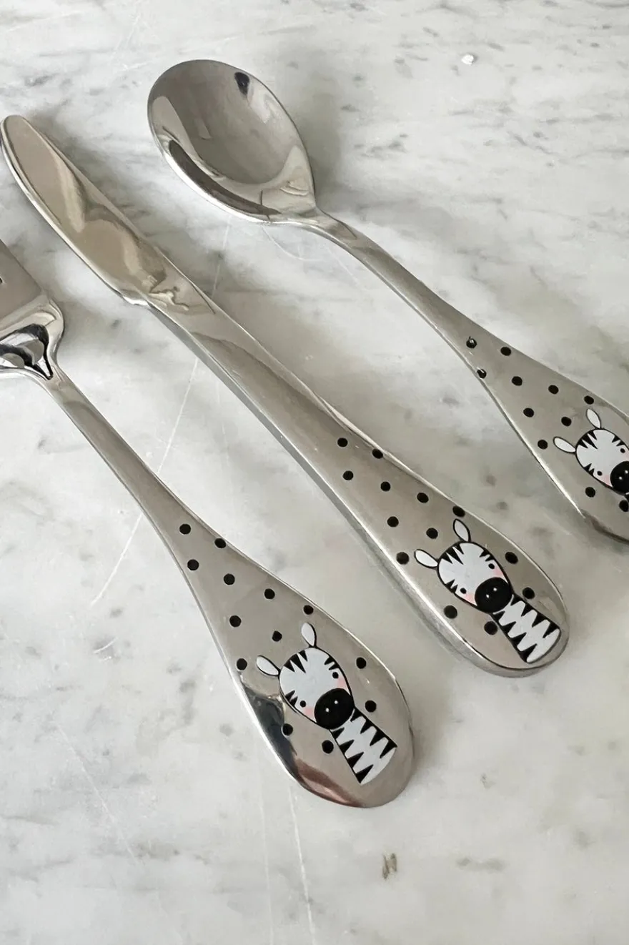 Set de cubiertos para los más pequeños de la casa con diseño propio Cristina Oria de acero inoxidable de alta calidad, diseñados con los bordes redondeados y con la ilustración de una cebra y puntos negros.