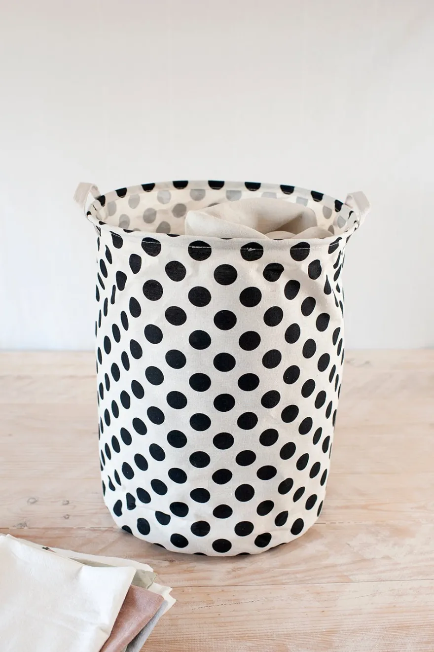 Cesto para la ropa elaborado en lona con diseño de topos negros y blancos, y con asas en los laterales.