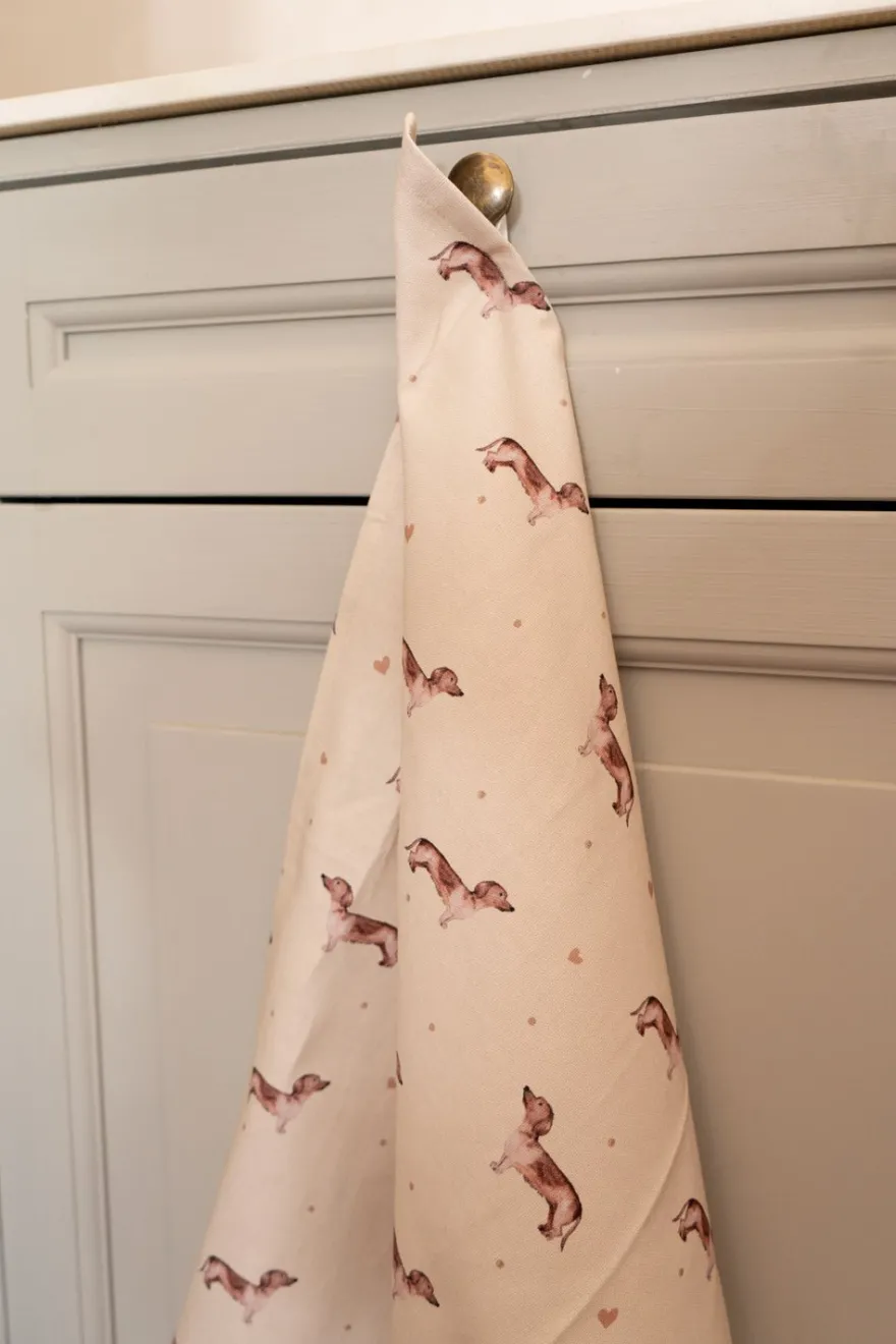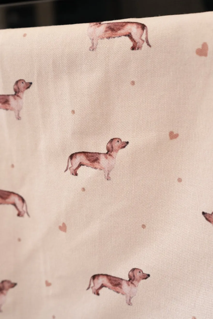 Paño de cocina de algodón con diseño de teckels y corazones.