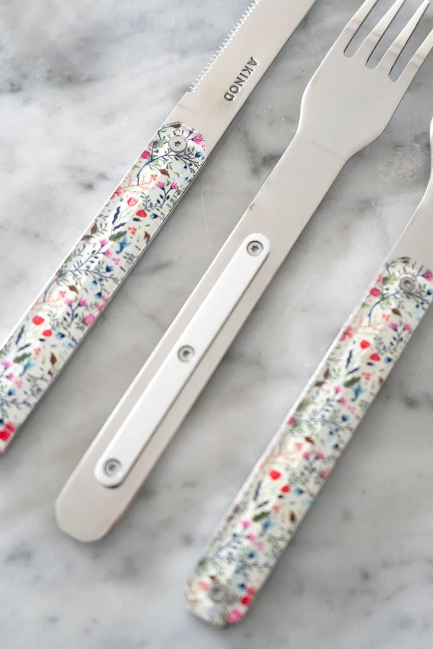 Cubiertos con diseño campestre de acero inoxidable compuestos por una cuchara grande, un tenedor de 4 dientes y un cuchillo con una hoja micro dentada.