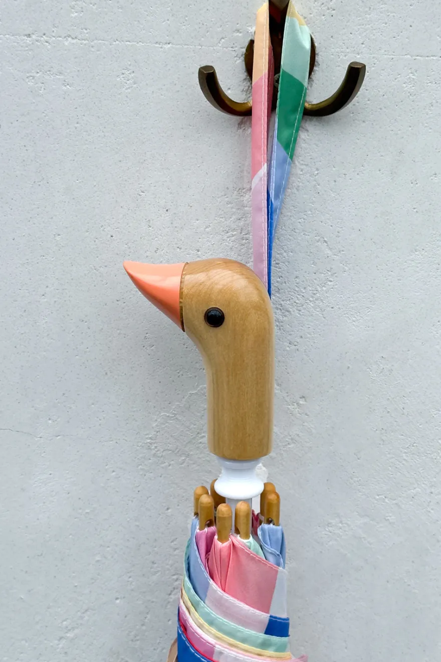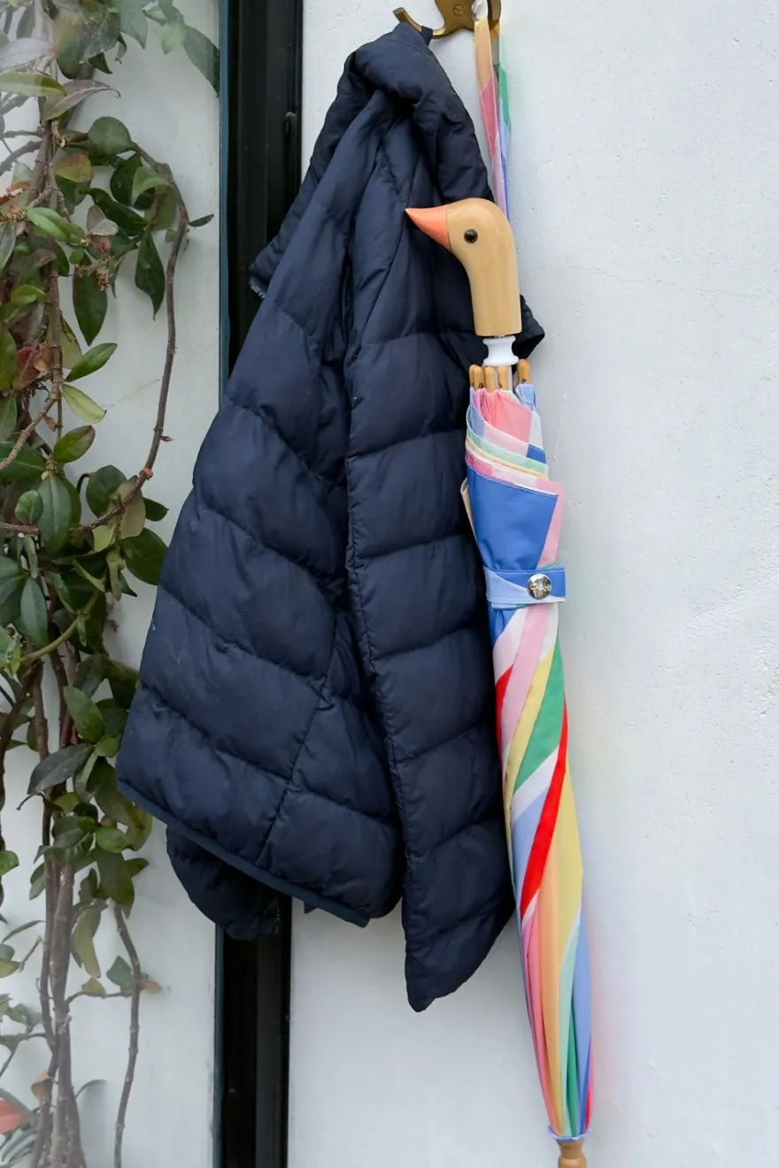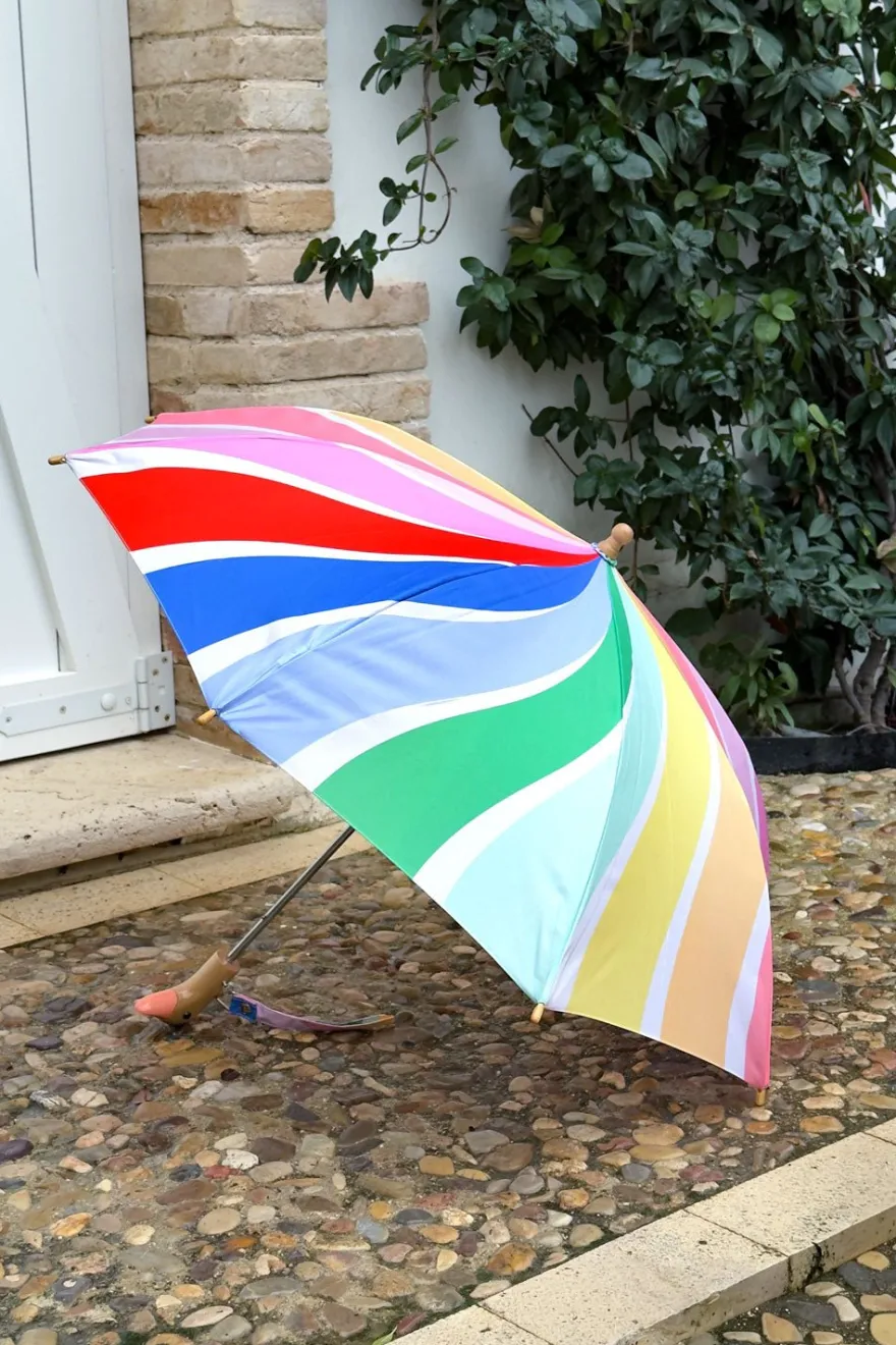 Este paraguas infantil con diseño de arcoíris está hecho a mano a partir de nueve botellas de plástico, con tela 100% reciclada y un mango de madera de origen sostenible.