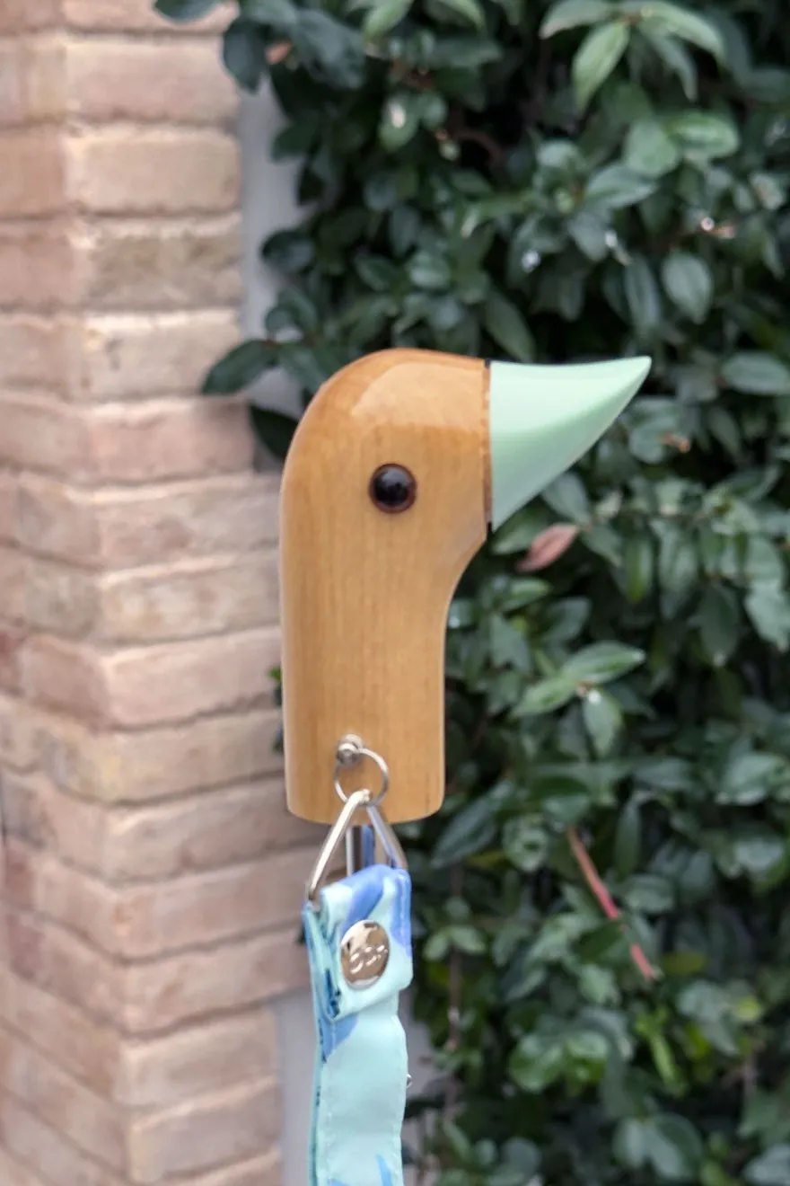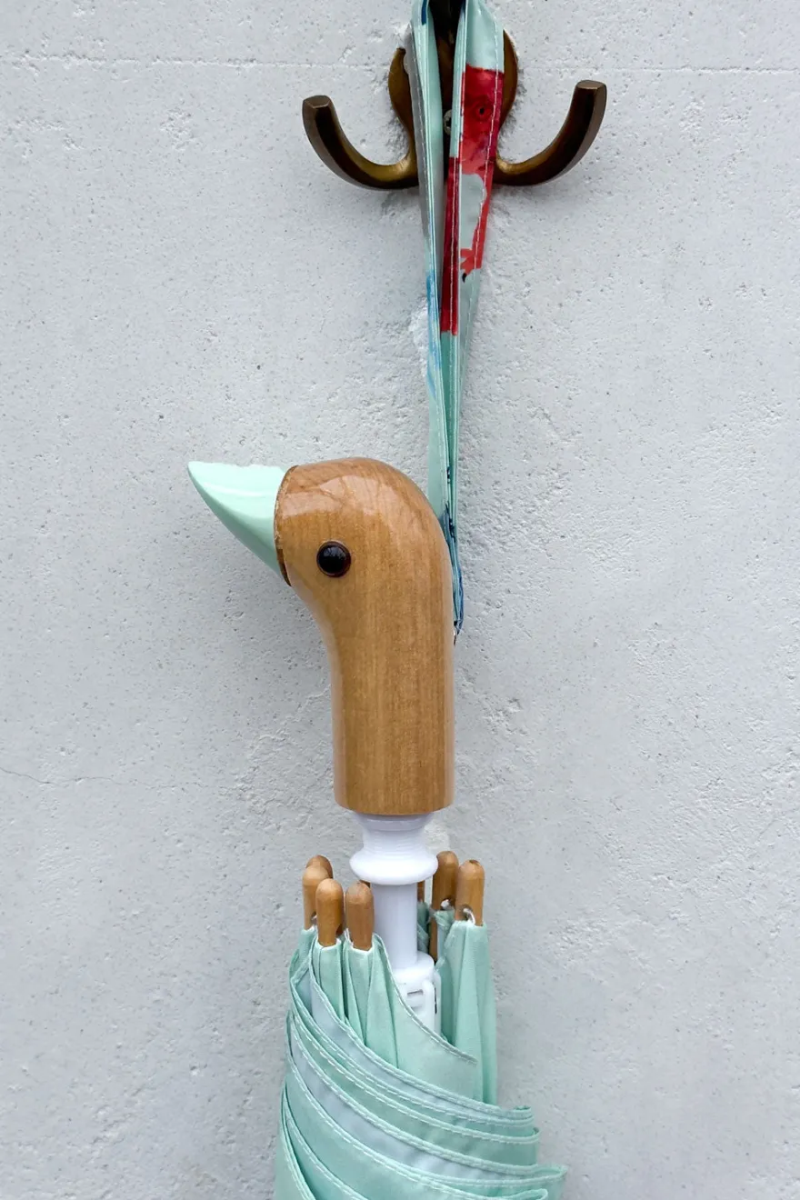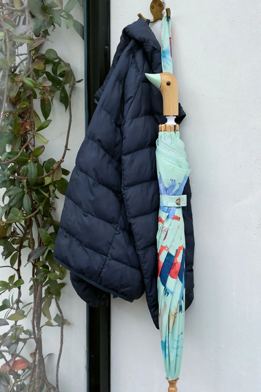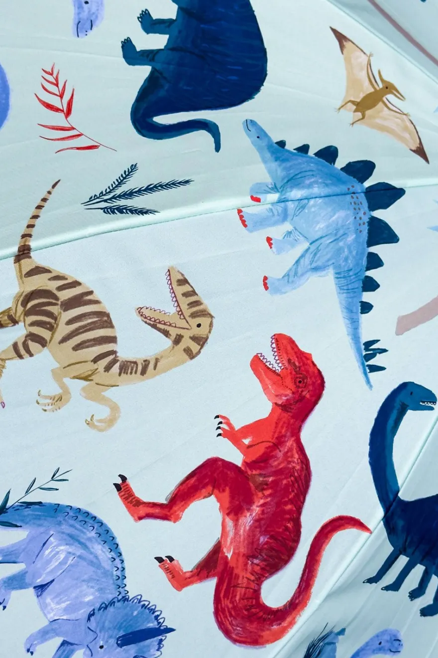Este paraguas infantil con diseño de dinosaurios está hecho a mano a partir de nueve botellas de plástico, con tela 100% reciclada y un mango de madera de origen sostenible.