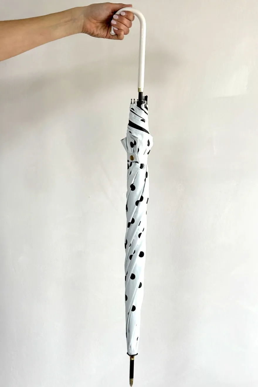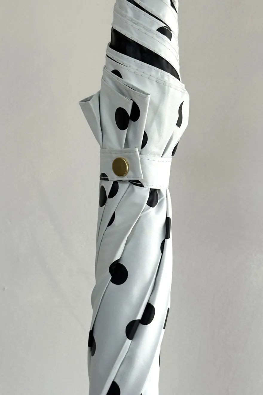 Paraguas con un elegante diseño de lunares negros sobre fondo blanco, una combinación clásica y atemporal que aporta un toque alegre y sofisticado a los días de lluvia. Su estampado de inspiración vintage lo convierte en un accesorio versátil que combina fácilmente con distintos estilos.