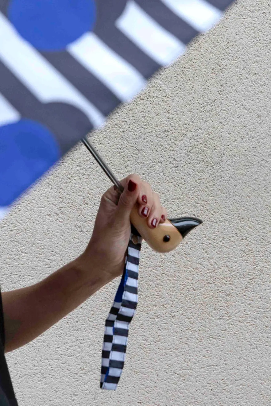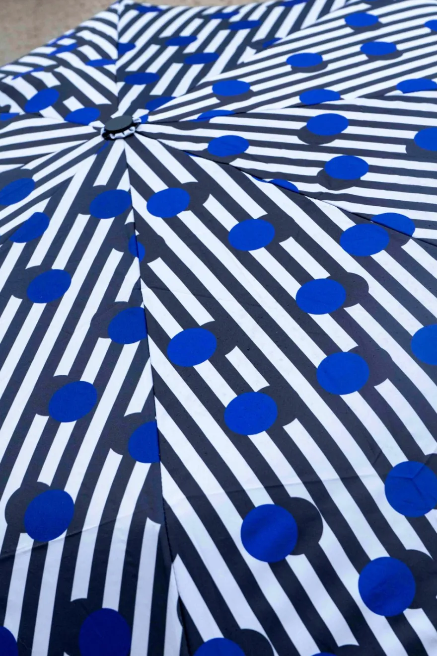 Paraguas con diseño de rayas negras y puntos azules y mango con cabeza de pato hecho a mano a partir de nueve botellas de plástico, y diseñado en Londres.