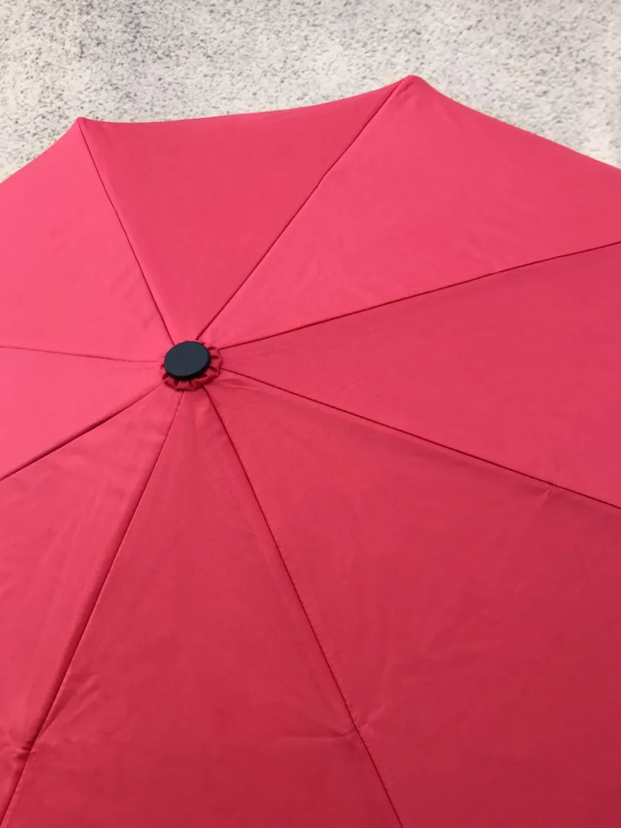 Paraguas con diseño rojo y mango con cabeza de pato hecho a mano a partir de nueve botellas de plástico, y diseñado en Londres.